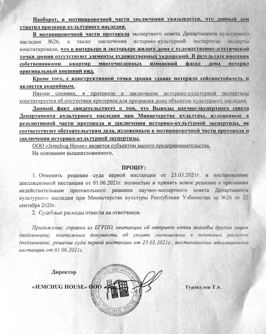 Очередная кассационная жалоба касается уже не Департамента культурного наследия, а образованного на его базе Агентства культурного наследия при вновь созданном Министерстве туризма и спорта. В жалобе, в частности, говорится: