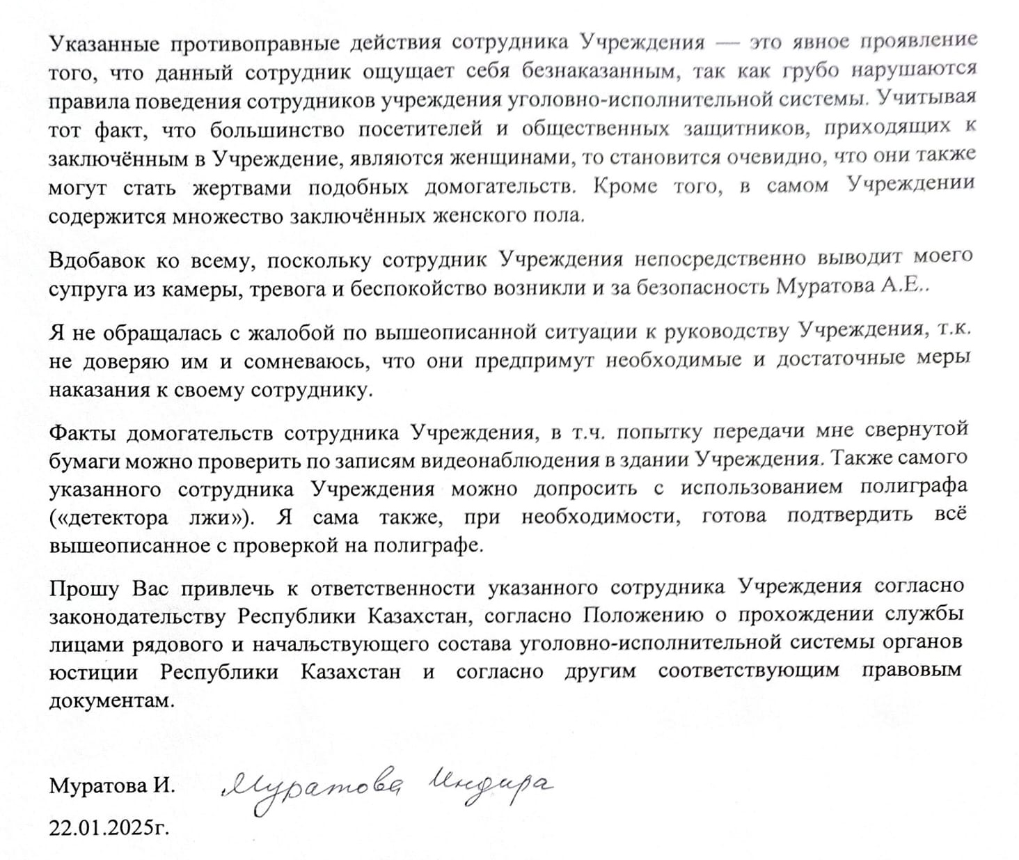 Я, Муратова Индира, состою в законном браке с Муратовым Акылбеком Еркиновичем, 16.07.1988 г.р., содержащимся в Учреждении №72 ДУИС по г. Алматы (далее – Учреждение). Являясь общественным защитником своего супруга, я регулярно посещаю его в Учреждении.