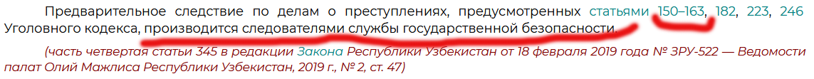 В уведомлении обращается внимание, что уголовное дело его подзащитного в части обвинения в совершении преступлений, предусмотренных ст. 159 (Пропаганда войны), и ч.2 ст. 156 (Возбуждение национальной, расовой, этнической или религиозной вражды) УК РУз подлежит передаче из СУ при ГУВД города Ташкента в СГБ Узбекистана, на основании статьи 345 (Подследственность уголовных дел) УПК РУз: «Предварительное следствие по делам о преступлениях, предусмотренных статьями 150-163 Уголовного кодекса производится следователями Службы государственной безопасности».