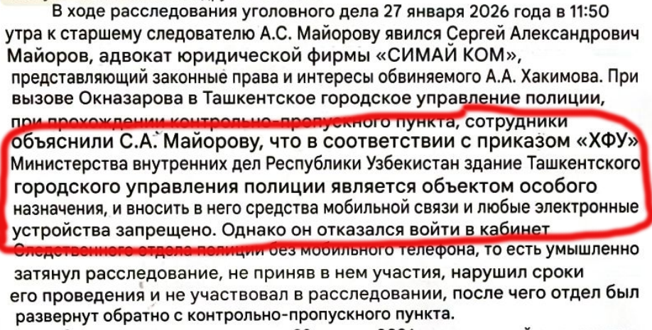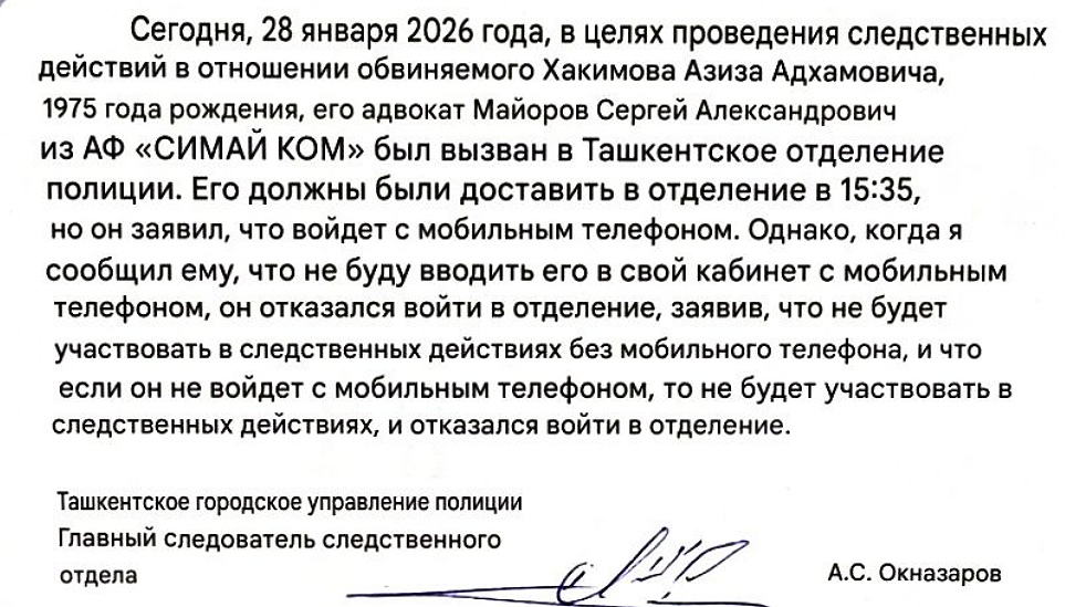 Согласно просьбе о проведении внутреннего расследования в отношении Сергея Майорова, направленной председателю Палаты адвокатов Республики Узбекистан Ш.Бекназаровым, «при прохождении контрольно-пропускного пункта [в здание ГУВД для обеспечения защиты А.Хакимова] сотрудники объяснили С.А.Майорову, что в соответствии с приказом «ХДФУ» [хизмат доирасида фойдаланиш учун; для служебного пользования] Министерства внутренних дел Республики Узбекистан здание Ташкентского городского управления полиции является объектом особого назначения, и вносить в него средства мобильной связи и любые электронные устройства запрещено. Однако он отказался войти в кабинет Следственного отдела полиции без мобильного телефона, то есть умышленно затянул расследование, не принял в нем участия, после чего (…) был развернут обратно с контрольно-пропускного пункта».