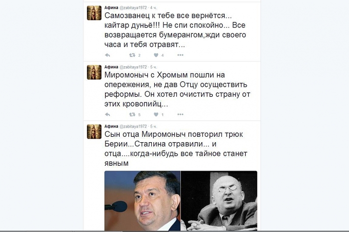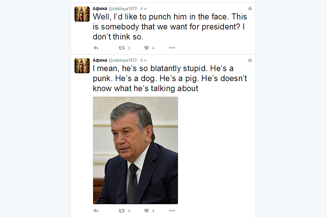 Далее она просто переходит к оскорблениям врио президента Шавката Мирзиёева (о его, мягко выражаясь, не слишком дружественных отношениях с Гульнарой хорошо написал публицист Ядгор Норбутаев).