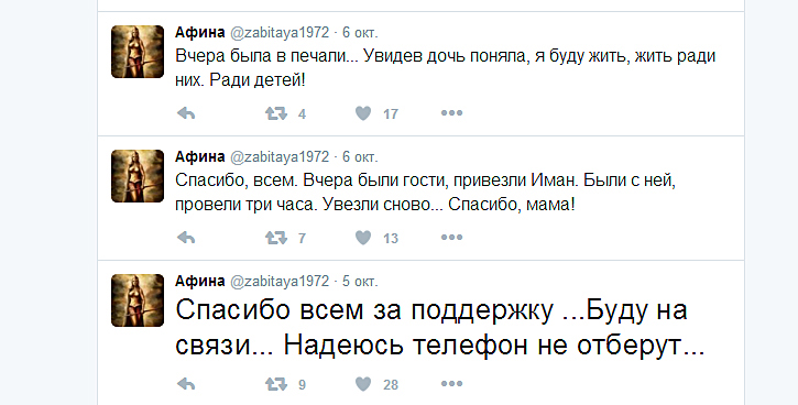 В последнем сообщении она поведала, что к ней идут гости и, возможно, мол, будут расстреливать. Вскоре после этого ее Твиттер-аккаунт «самоликвидировался». Это вовсе не означает, что у нее отобрали телефон, скорее всего, ей просто сделали серьёзное внушение и запретили заниматься «изобличениями» в Твиттере.