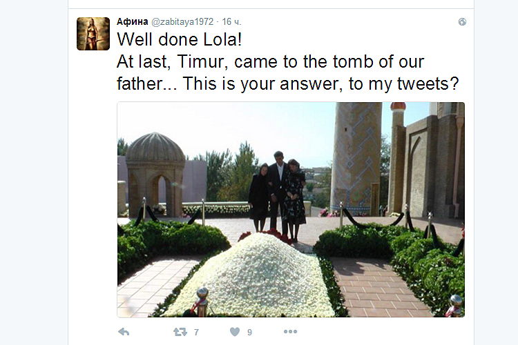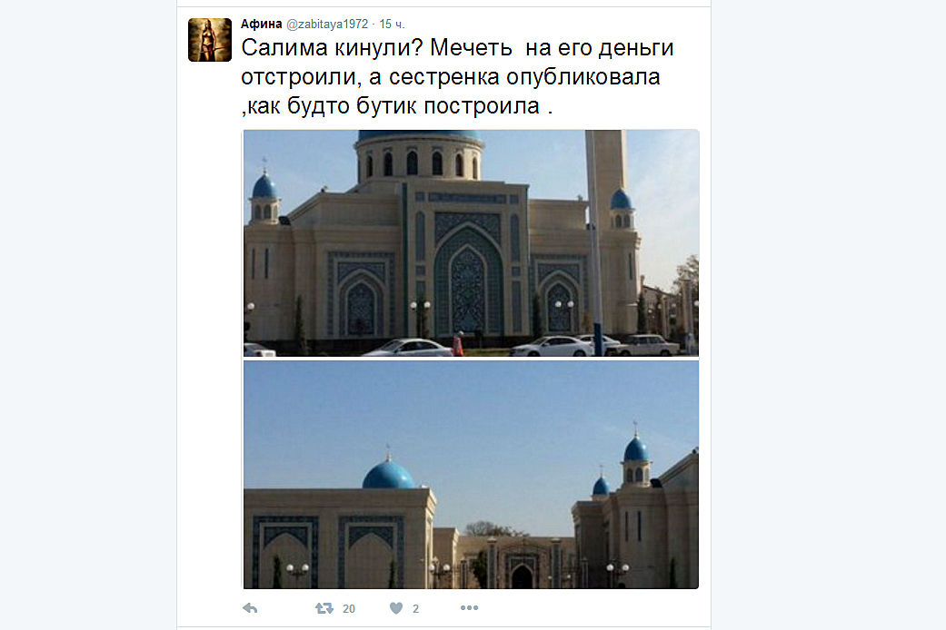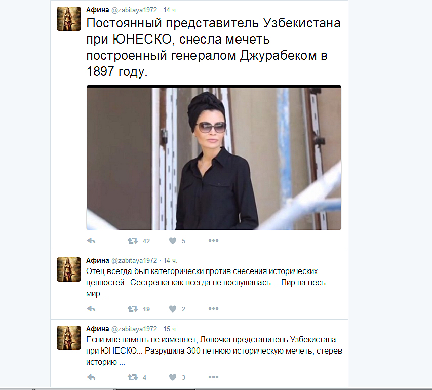 «Салима кинули? Мечеть на его деньги построили, а сестренка опубликовала, как будто бутик построила». (Речь идет о построенной в 19-м веке и сгоревшей год назад мечети Джурабек в Ташкенте. Ее остатки были снесены, а на ее месте воздвигнута новая мечеть, якобы на деньги Лолы, причем, названная в честь ее отца - AsiaTerra). «Если мне не изменяет память, Лолочка представитель Узбекистана при ЮНЕСКО… Разрушила 300 летнюю историческую мечеть, стерев историю…».