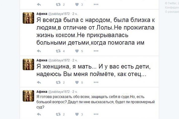 Занятно, что собственные преступления, связанные с масштабной коррупцией и вымогательством, она именует «ошибками», и упоминает, что просила за них прощения, правда, как можно понять, не у пострадавших, а у своего отца, в итоге так и не отдавшего ее под суд.