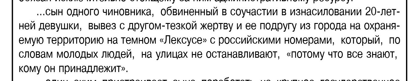 «…Можно сделать вывод, что во всей этой истории надзорный орган играет роль ведомого и озвучивает чужую позицию. Поэтому-то и не хотят отвечать на неудобные вопросы, которых немало, - говорится в статье павлодарского журналиста Александра Баранова. […] - Из пояснений прокурора следует, что сын акима области был свидетелем преступления. Спрашивается, почему же он не предотвратил его или не заявил о нем. Тем более что произошло всё на территории государственной резиденции, охраняемой полицией. Неплохо было бы прояснить, как на охраняемой территории вообще оказались потерпевшая и изнасиловавший ее гражданин Г.». (Информационный портал Республика, 19 мая)