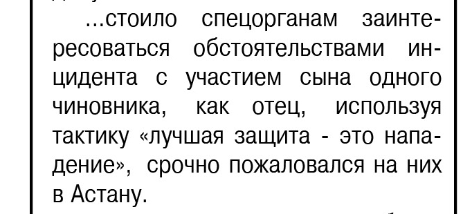 И вот прокуратура без тени смущения заявляет, что «показания потерпевшей и других участников уголовного процесса, а также заключения ряда экспертиз» свидетельствуют о том, что сын акима к преступлению не причастен. Более того, прокурор области специально уточняет: «сын Бозумбаева не был прямым свидетелем и очевидцем произошедшего».