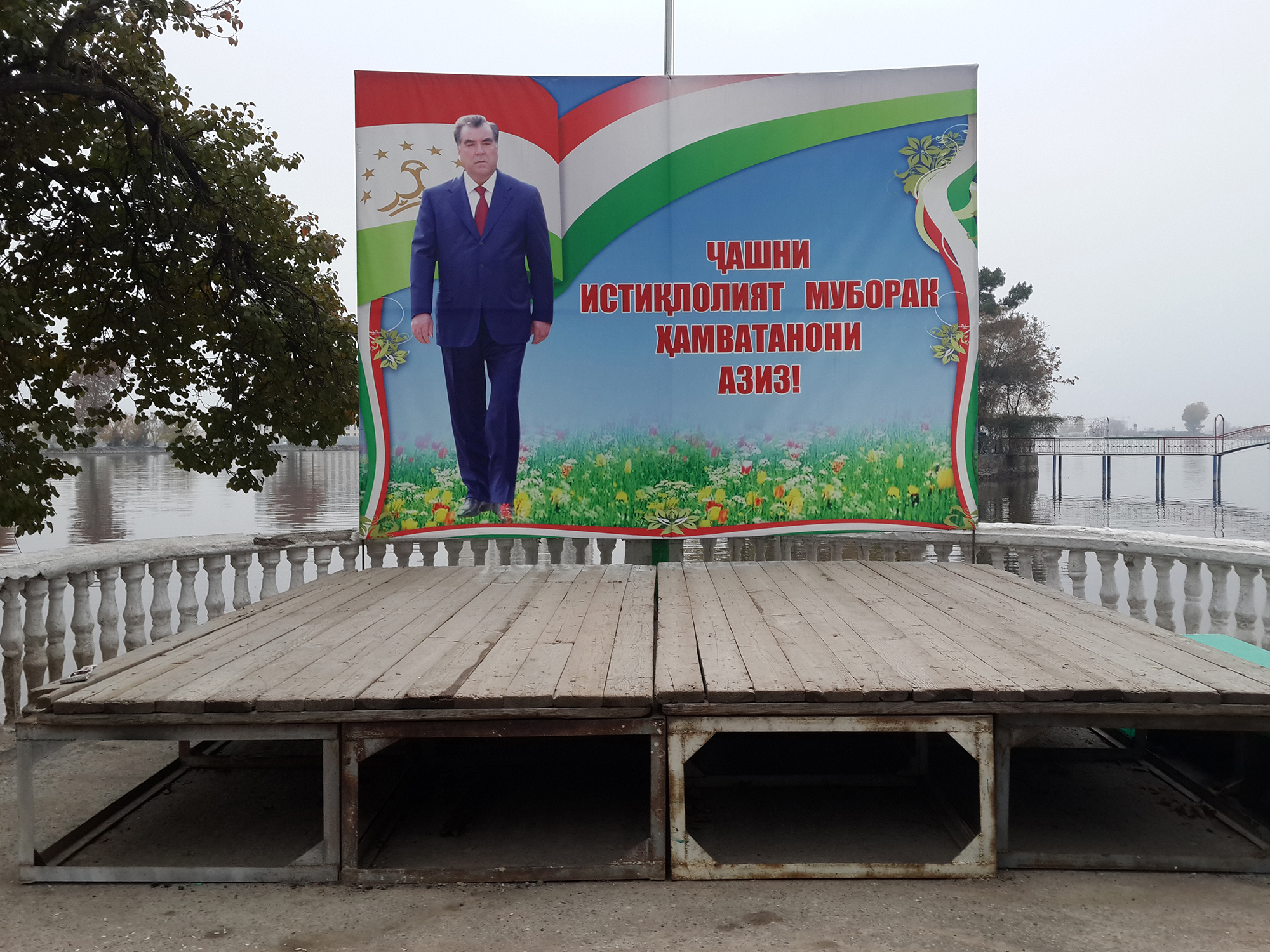 Душанбе, плакат в парке с изображением президента Таджикистана Эмомали Рахмона