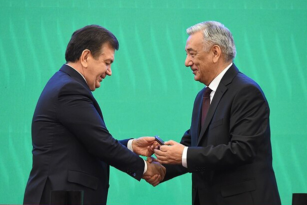 Глава ЦИК Узбекистана Мирза-Улугбек Абдусаломов вручает Шавкату Мирзиёеву удостоверение Президента Республики Узбекистан. Ташкент, 14 декабря 2016 года