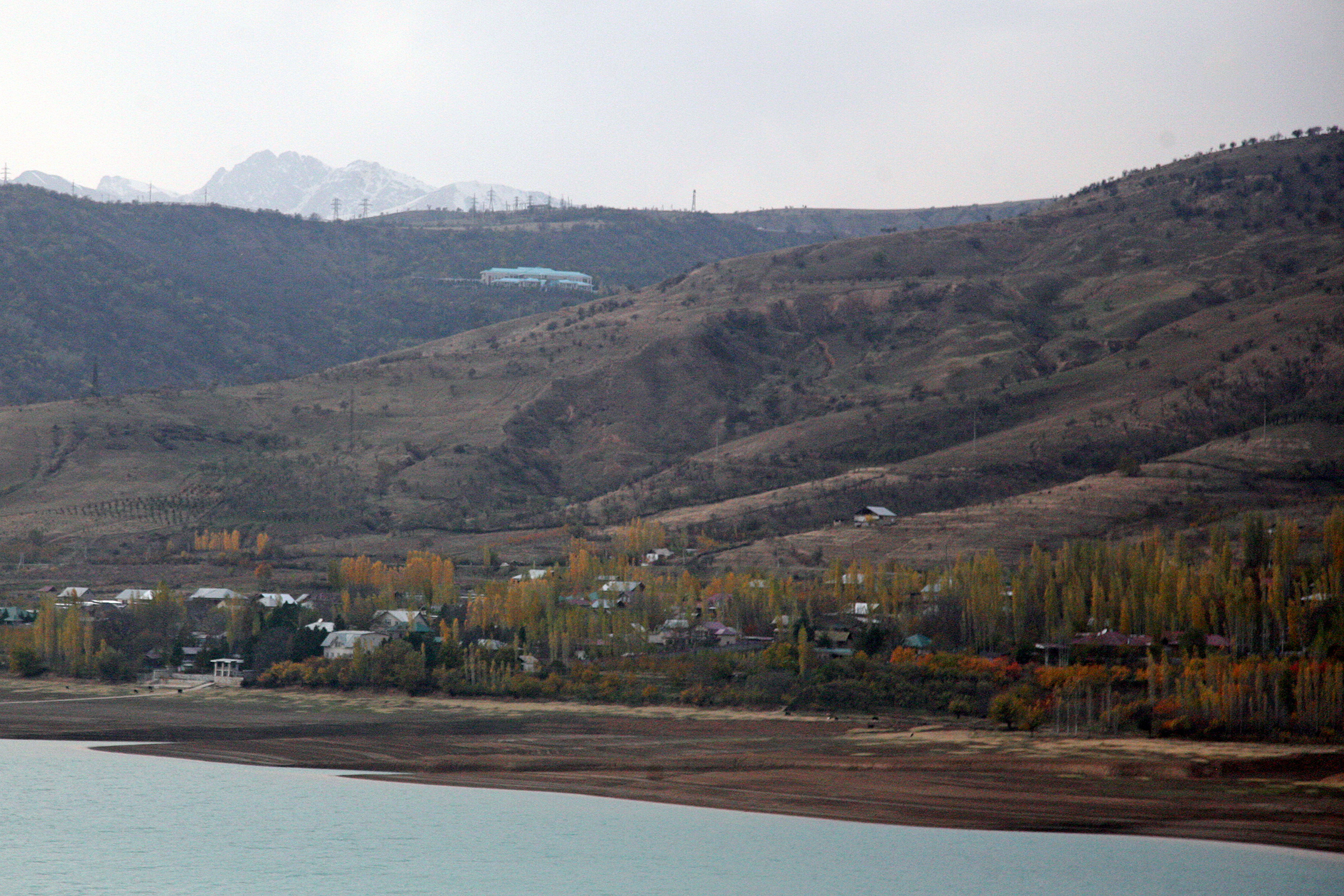 Поселок Сиджак на берегу Чарвакского водохранилища. Наверху - резиденция Ислама Каримова