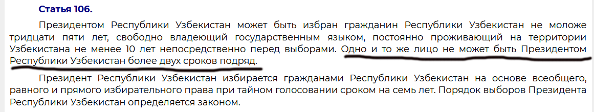 Проведение самого референдума в целом было законным (не считая того, что к подсчету голосов независимые наблюдатели не допускаются), но ведь на нем не ставился вопрос об отмене 106-й статьи – она присутствует в неизменном виде, и, естественно, распространяется на всех граждан Узбекистана, в том числе и на Мирзиёева. И, в соответствии с ней, он НЕ МОЖЕТ избираться на третий срок.
