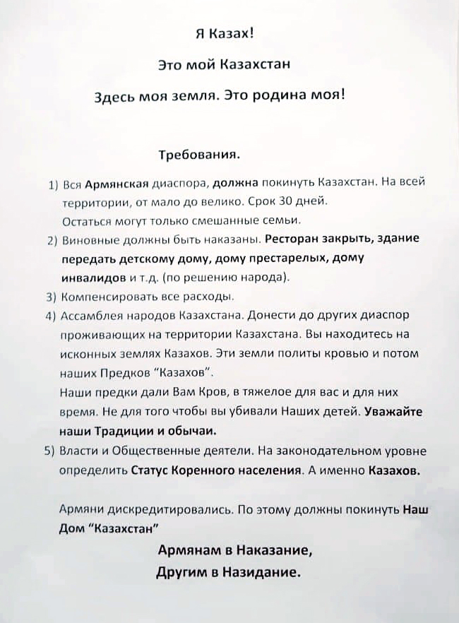 «Массовые протесты, вызванные убийством в Караганде, серьезно встревожили армян, живущих в Казахстане. Более 20 граждан Армении были уже выдворены из Казахстана, а оставшиеся живут в постоянном страхе. Кровавый инцидент в ресторане принял межнациональный характер и государственные масштабы», - пугающе уведомила интернет-газета Novosti.az.
