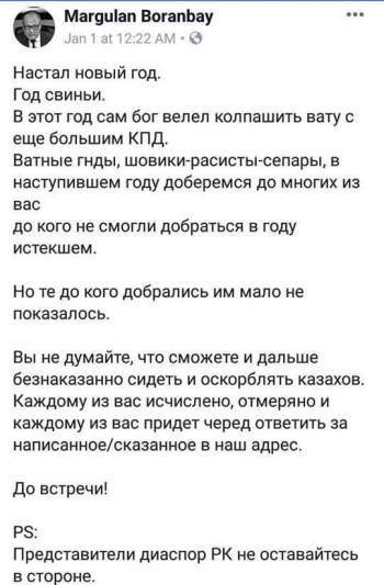 «Казахи, не поддавайтесь ублюдкам, которые хотят посеять хаос в республике ради достижения личных целей. Это убийство стало лишь поводом для реализации своих грязных планов!»