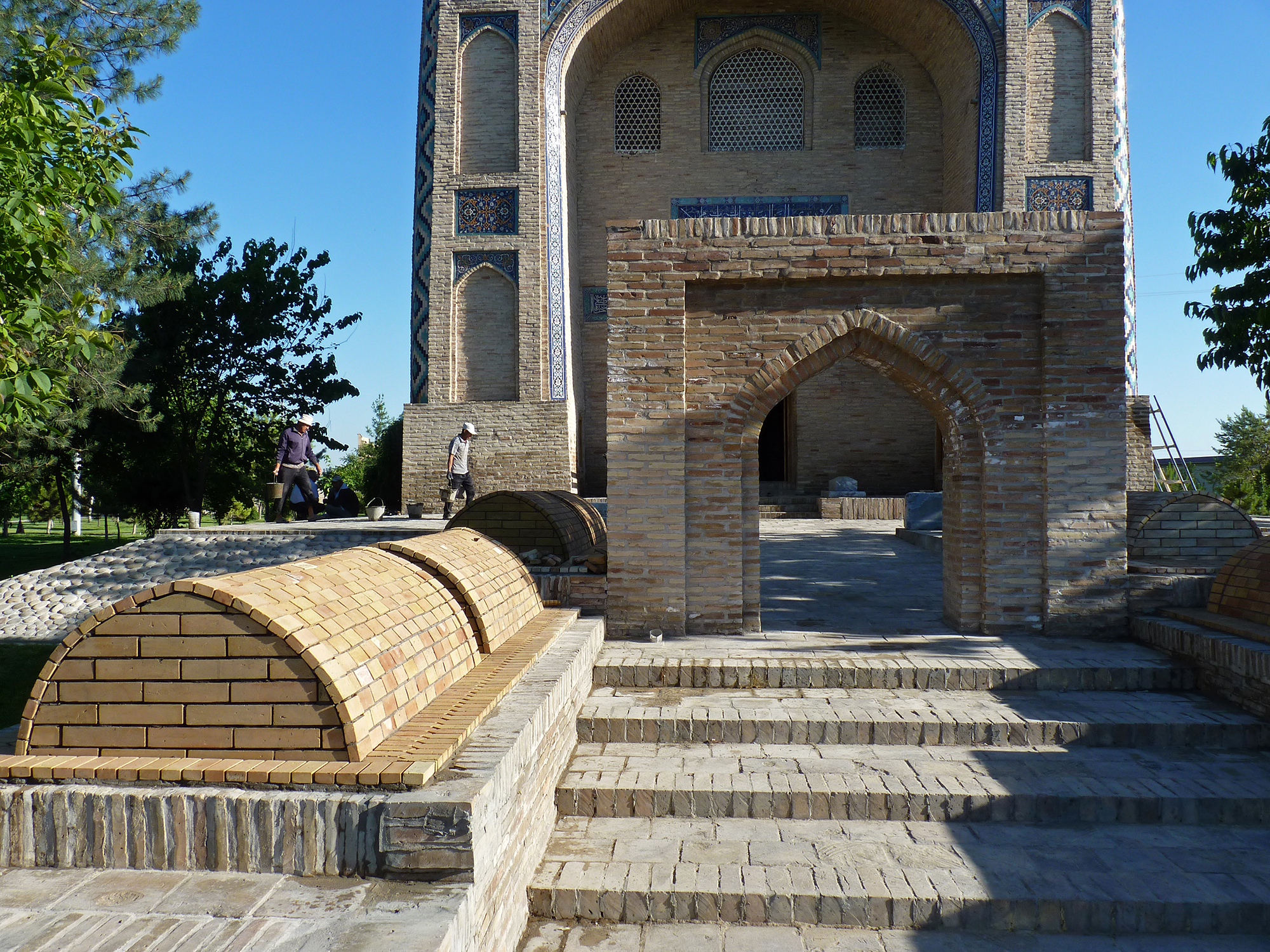 В первом случае рабочие, в основном, «облагородили» окружающее здание пространство, обложив его булыжниками и скрепив цементным раствором. Что-то латалось квадратными кирпичами типа «оби». А могилы сыновей, учеников и последователей Каффаля аш-Шаши, некогда расположенные во внутреннем дворике мавзолея, а ныне перед его входом, были украшены новенькой современной плиткой.