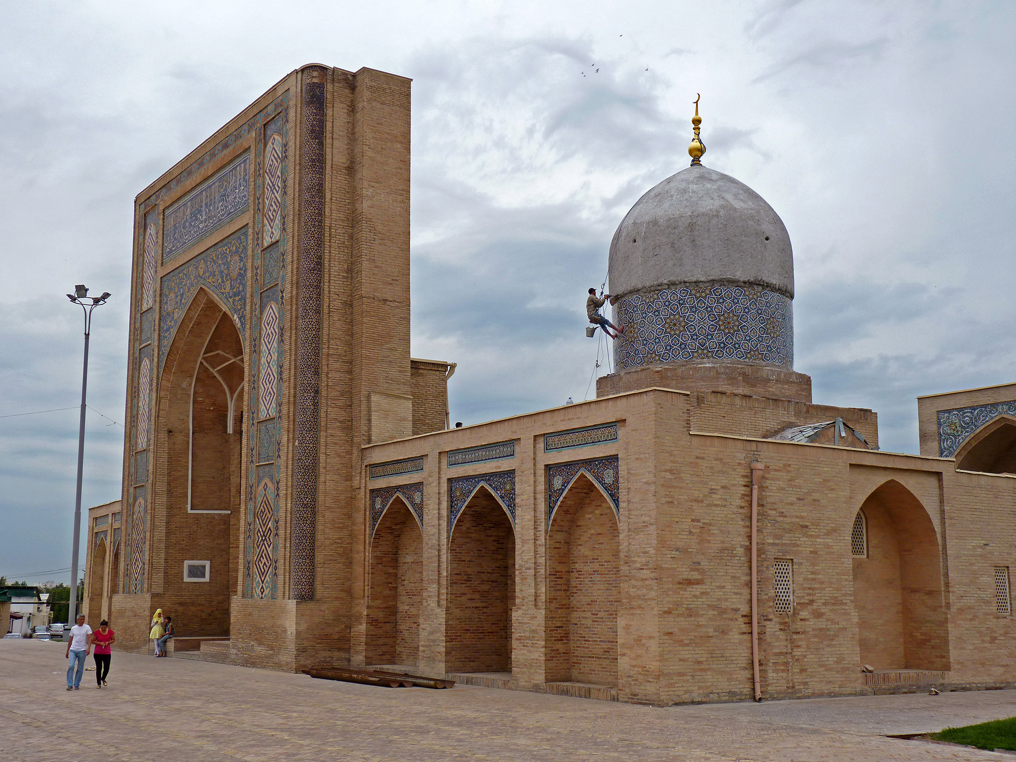 Напомню, что мавзолей – это одно из старейших зданий Ташкента. Первоначальная усыпальница «Святого имама» не сохранилась, а нынешняя была возведена на её месте в 1542 году, во время правления династии Шейбанидов, ханским архитектором того времени Гулямом Хусаином. На нем сохранилась майолика XVI века с надписью, содержащей имя мастеров-зодчих и дату строительства. Этот памятник представляет собою большую историческую и художественную ценность.