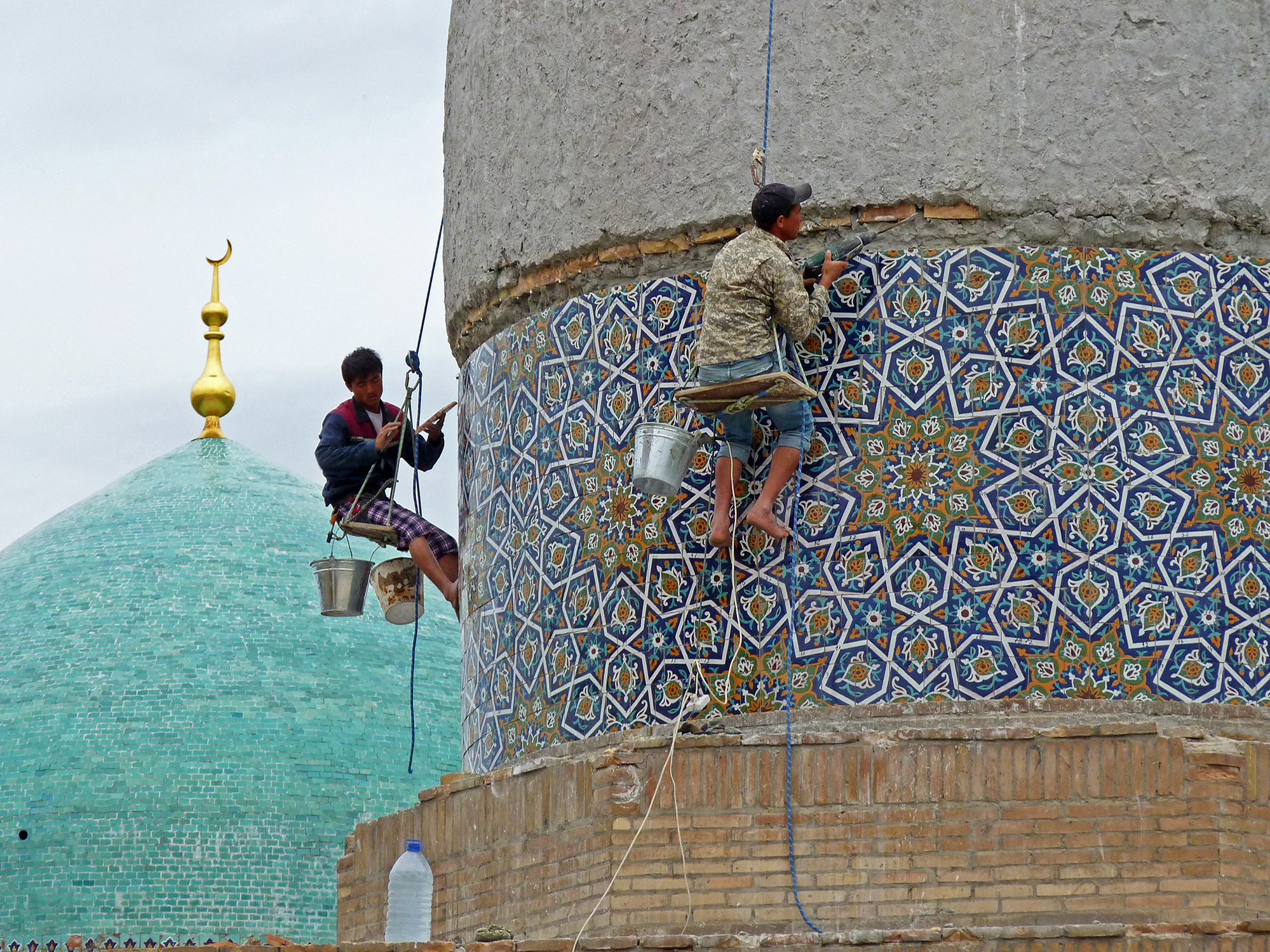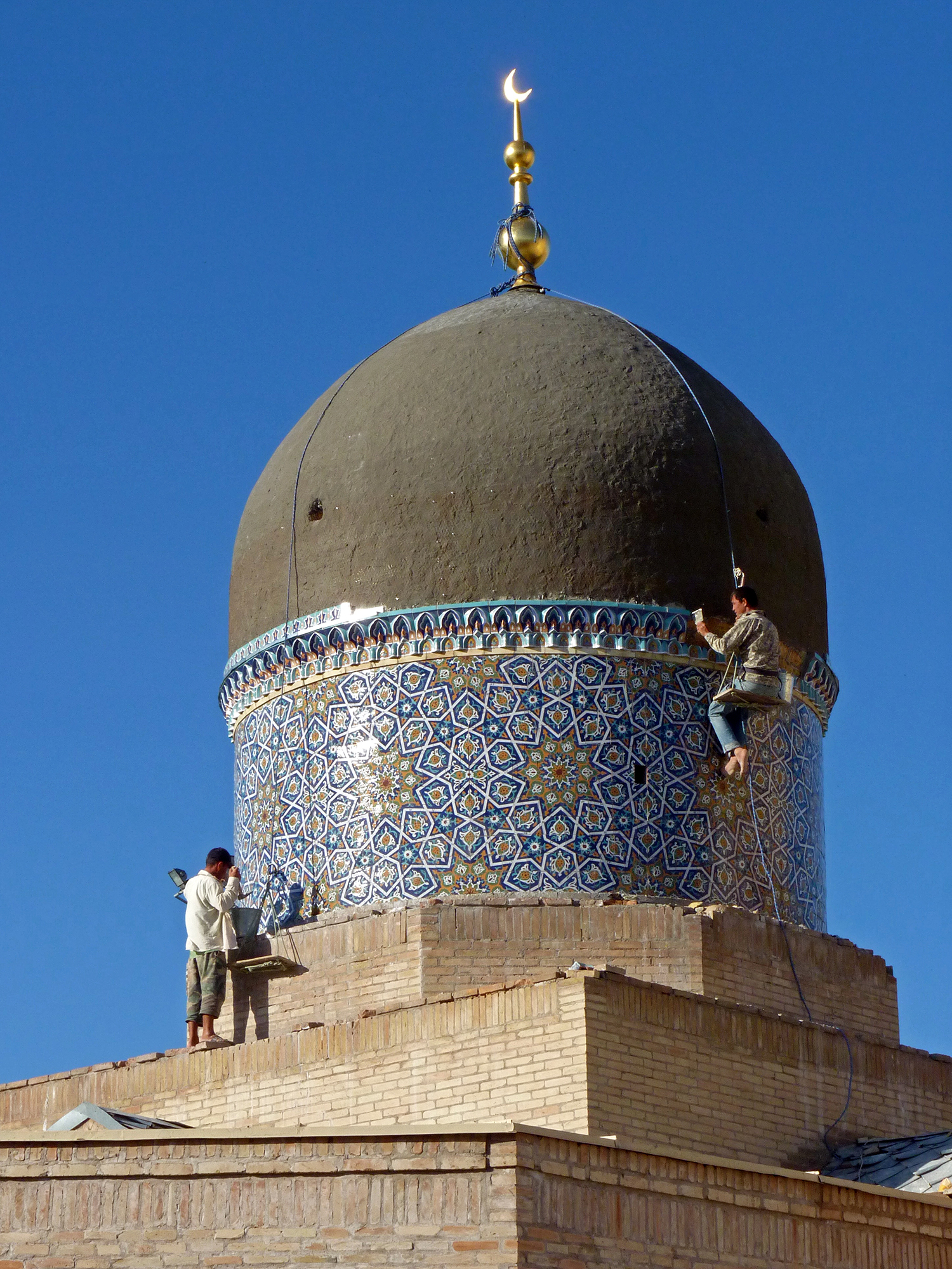 В этом медресе на протяжении всего мая заново перелицовывали голубой мозаичной плиткой один из куполов. Интересно, что оба эти купола на высоких основаниях, нередко выдаваемые гидами для интуристов за старинные, появились здесь лишь в 2007 году, во время вышеупомянутой перестройки комплекса. Их приделали вместо прежних, не отличающихся высотой, решив, что так будет гораздо красивее.