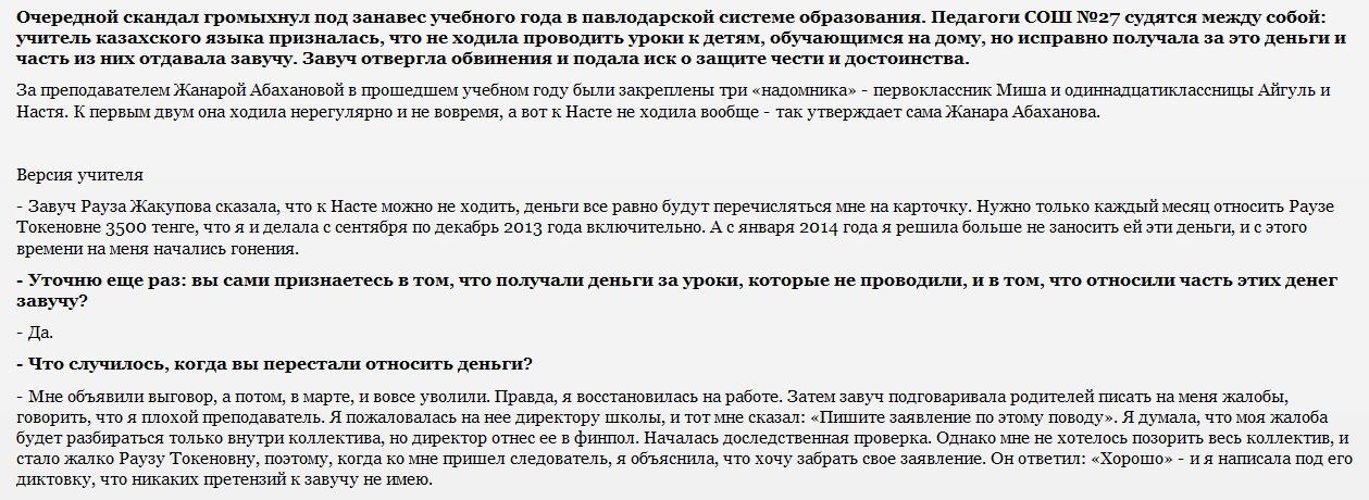 Порочащей честь и достоинство была признана лишь одна фраза из статьи «Уроки наживы»: «Завуч Рауза Жакупова сказала, что к Насте можно не ходить, деньги все равно будут перечисляться мне на карточку. Нужно только каждый месяц относить Раузе Тукеновне 3500 тенге, что я и делала с сентября по декабрь 2013 года включительно. А с января 2014 года решила больше не заносить ей эти деньги, и с этого времени на меня начались гонения…».