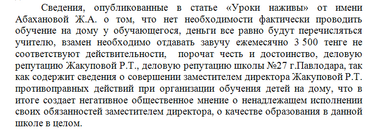 «…Гр-ка Абаханова Ж.А. в газете «Версия» […] в форме интервью распространила следующие сведения: «…Завуч Рауза Жакупова сказала, что к Насте можно не ходить, деньги все равно будут перечисляться мне на карточку. Нужно только каждый месяц относить Раузе Токеновне 3500 тенге, что я и делала с сентября по декабрь 2013 года включительно. А с января 2014 года я решила больше не заносить ей эти деньги, и с этого времени на меня начались гонения…».