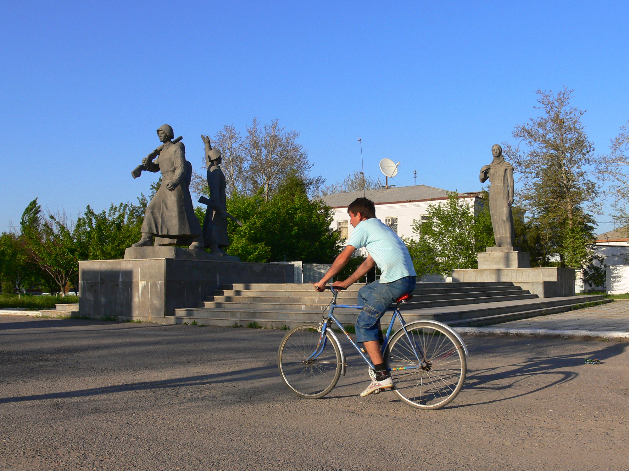Около одиннадцати и добрался до Пскента, где решил позавтракать. Возле дороги я увидел недавно построенный памятник Скорбящей матери со списком солдат из этого города, погибших во время войны. Я остановился и сфотографировал его.