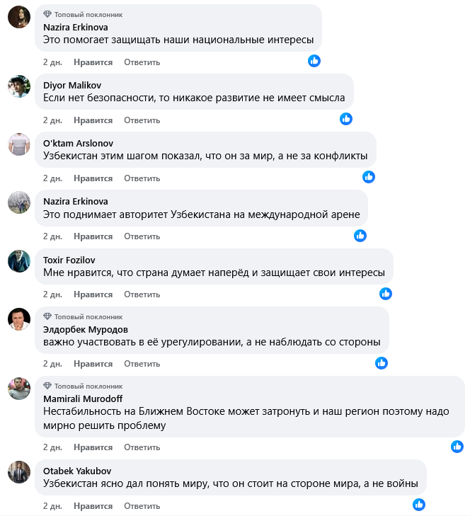 «Очень хорошо что Узбекистан участвует в установлении мира на Ближнем Востоке». Alisher Kanayev. Уже оставлял комментарий, профиль описывается выше.