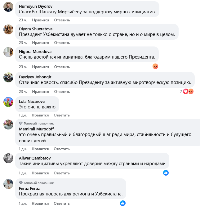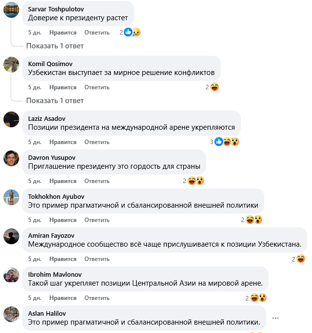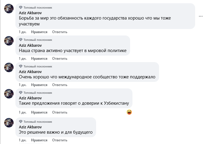 «Узбекистан последовательно поддерживает инициативы, направленные на укрепление мира и стабильности». Osiyo Said. Уже оставлял комментарий, профиль описывается выше.