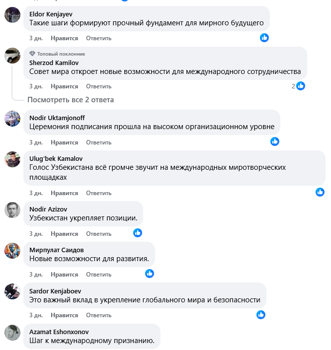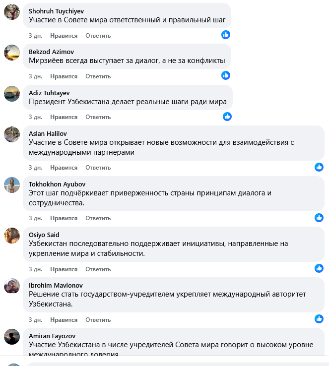 «Участие Узбекистана в числе учредителей Совета мира говорит о высоком уровне международного доверия». Amiran Fayozov. Уже оставлял комментарии, профиль описывается выше.