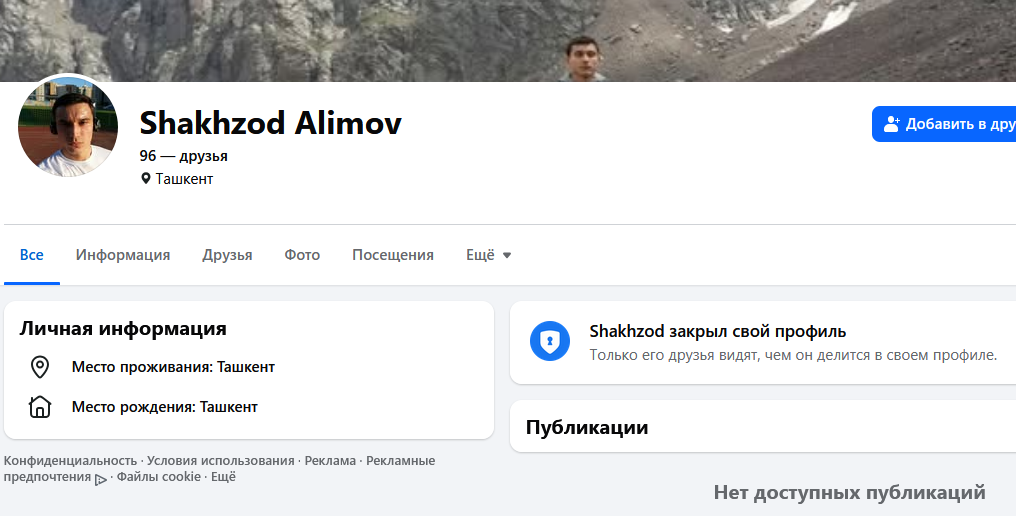 «Мы верим Президенту пусть будет мир». Bobur Nizomiddinov. Информации ноль, друзей нет, подписчиков 41, публикаций 4. Профиль создан 16 июня 2021 года.
