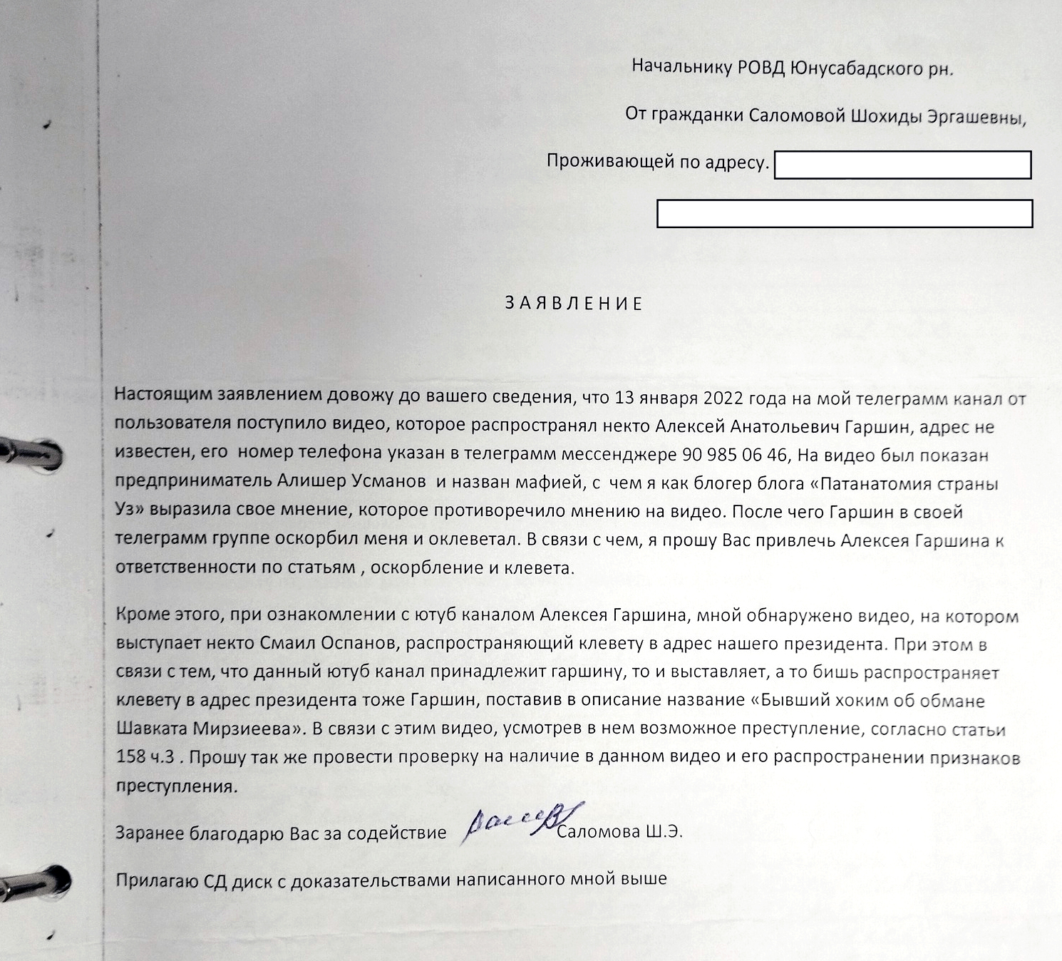 Сама Саломова объяснила поданное против него заявление тем, что когда она комментировала какой-то видеосюжет Алексея Гаршина, то критика ему якобы не понравилась и он её оскорбил. Заявление на него было подано предположительно в конце января, так как дата на нем не указана.
