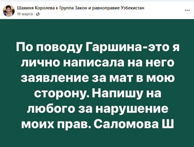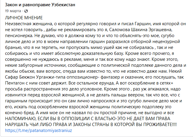 Гаршин обвиняется в оскорблении блогерки Шохиды Саломовой (Шахины Саломовой), ведущей группы «Патанатомия страны Уз» в соцсетях.