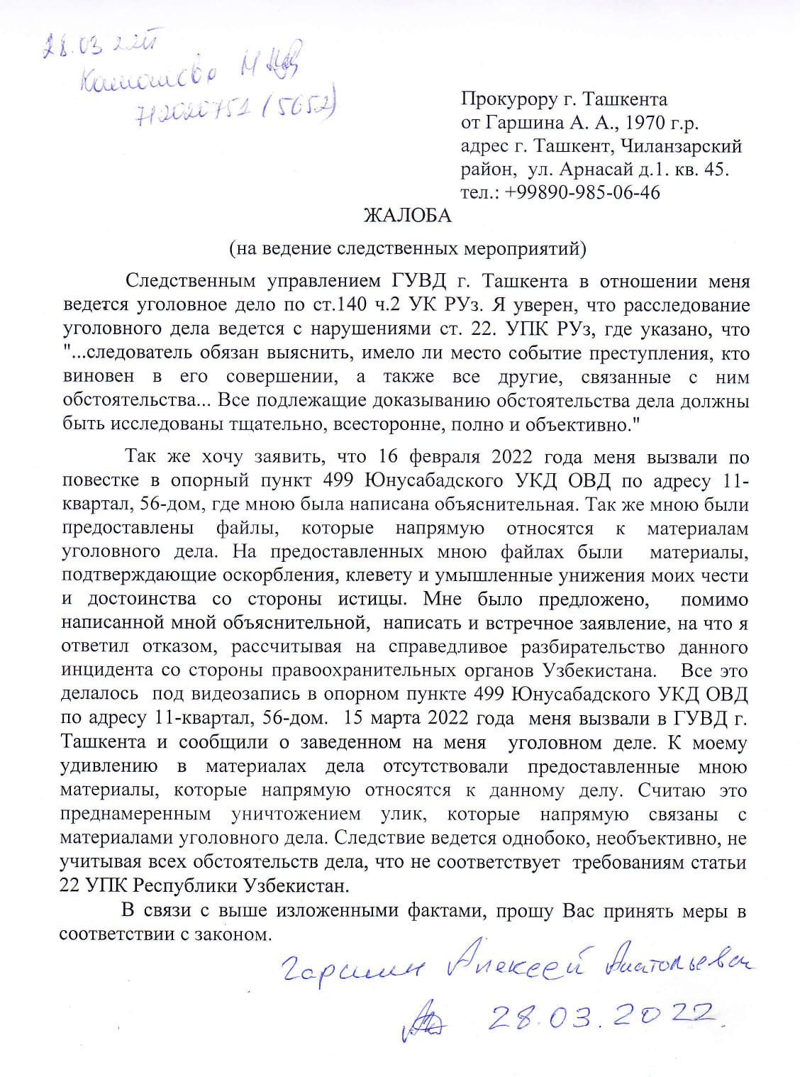 На основании этого заявления на него завели уголовное дело по статье 140 (Оскорбление) Уголовного кодекса Республики Узбекистан. Отметим, что под действие Уголовного кодекса оскорбление подпадает лишь после административных взысканий за это правонарушение; насколько известно, подобных взысканий у Гаршина не было.