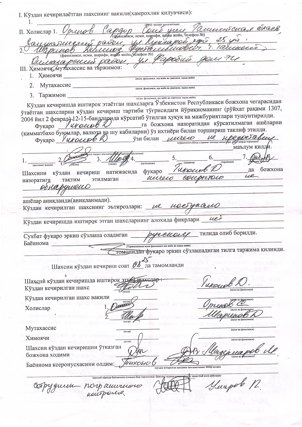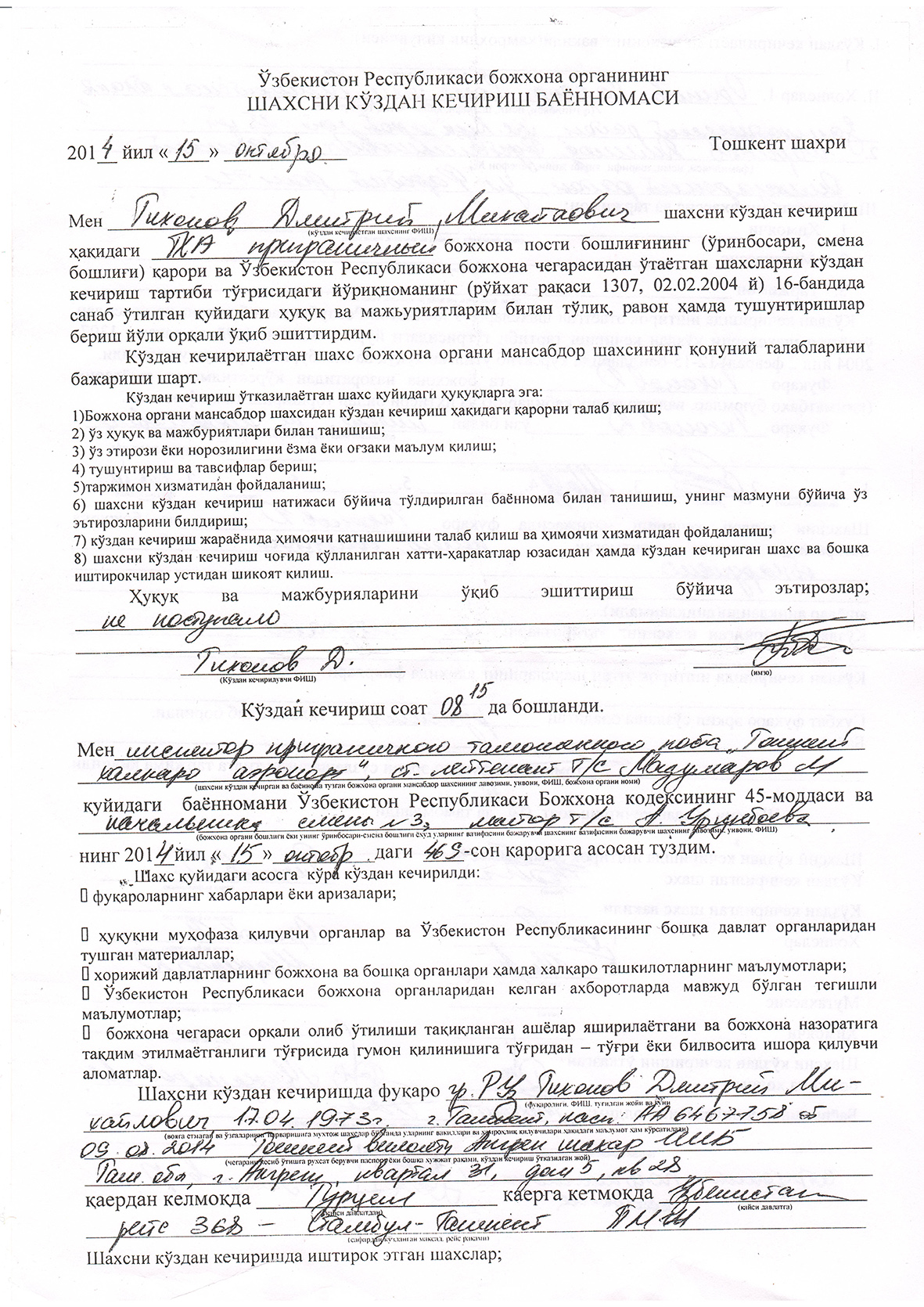 По словам Дмитрия Тихонова, с сентября прошлого года, когда были введены новые правила досмотра, его подвергают внимательному личному досмотру при каждом пересечении узбекской границы в обоих направлениях, а его вещи осматриваются в присутствии понятых и с составлением протокола.