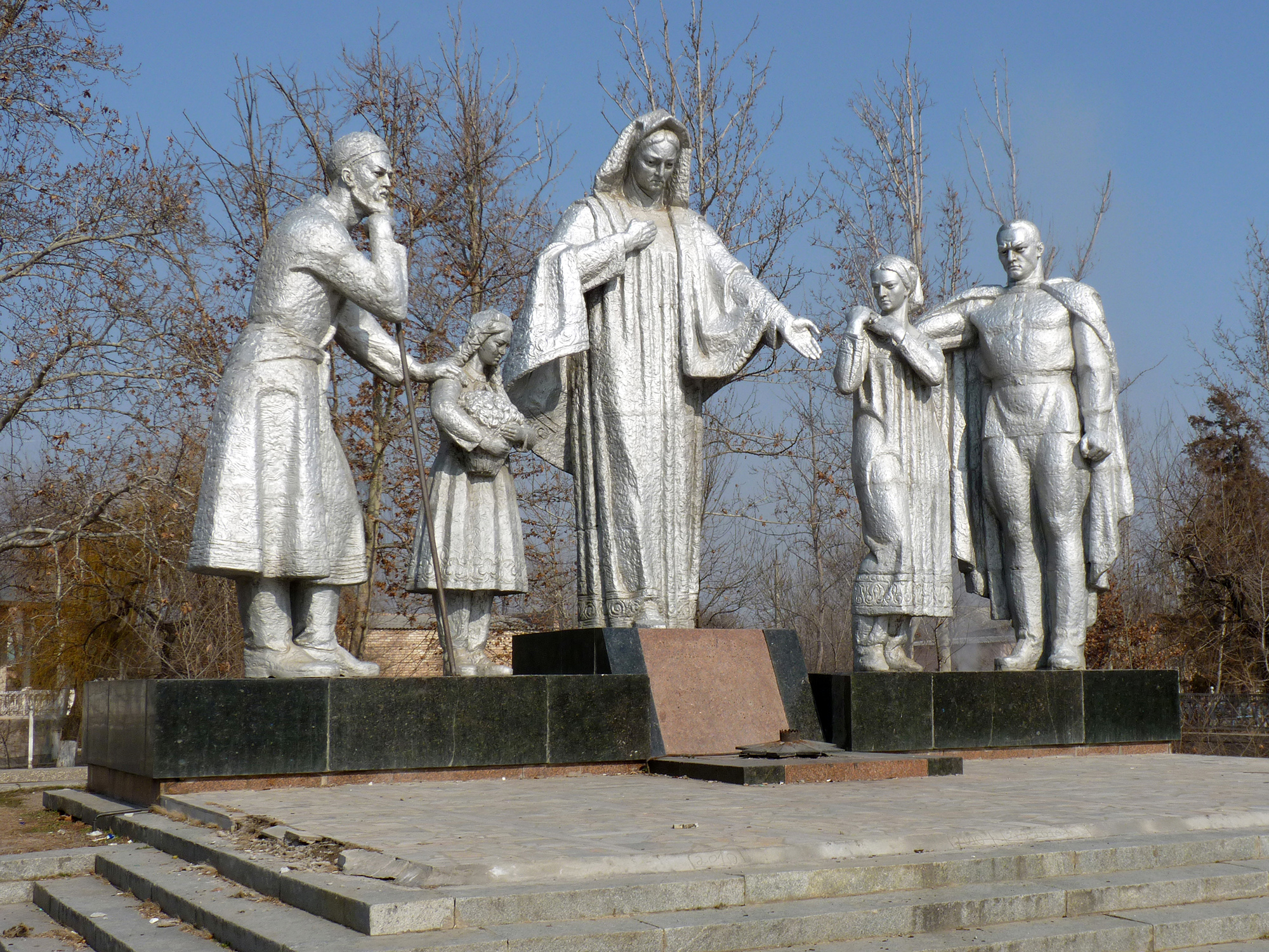 Большинство советских памятников участникам Второй Мировой войны объединяет то, что они находятся в полузаброшенном состоянии, чувствуется, что за ними почти нет ухода. Вечные огни перед ними нигде не горят. И это не недосмотр нынешней узбекской власти, а проявление навязываемой Каримовым госидеологии: если бы речь шла о памятнике Тамерлану, из простого разбойника ставшего правителем государства и завоевателем, покорявшим и грабившим соседние страны, ситуация была бы совсем иной.