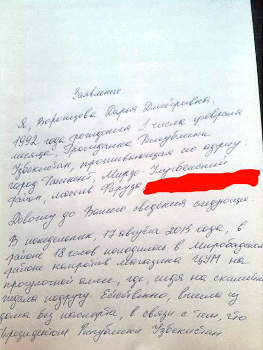После оживленного обсуждения произошедшего с Дарьей Воронцовой, и многочисленных советов не оставлять это дело так, а попытаться наказать вымогателя, обратившись в милицию, девушка решила так и сделать. 20 августа она написала, что побывала в Мирабадском РОВД города Ташкента (всё произошло в этом районе):
