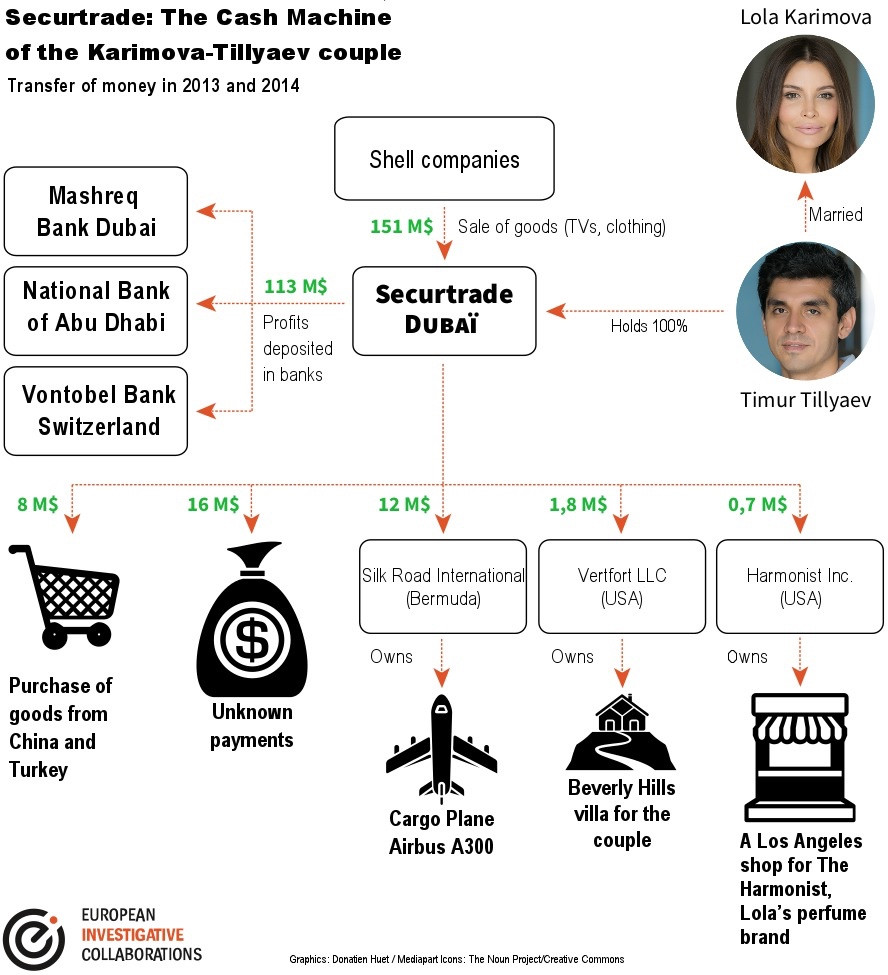 Расследователи The Blacksea.eu пришли к выводу, что Лола и ее муж используют сложную схему с офшорами, в результате которой деньги перечисляются из Узбекистана на счета их компаний в «налоговых гаванях». В начале 2013 года Тимур Тилляев создал импортно-экспортную компанию Securtrade в Дубае, в которой он был единственным акционером. Его фирма поставляла импортные товары – одежду и телевизоры – на рынок Абу-Сахи. Руководство компанией он доверил своему компаньону и приятелю Довронбеку Алимбекову. Securtrade вела свою коммерческую деятельность через десятки компаний-посредников, зарегистрированных в офшорах.