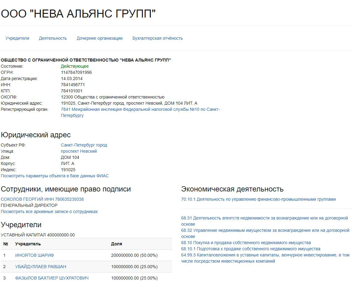 «Нева Альянс Групп», основной сферой деятельности которой является управление недвижимостью, имеет уставный капитал в 7 миллионов долларов (400 миллионов рублей). Шариф Иноятов вложил в эту компанию 3,5 миллиона долларов.