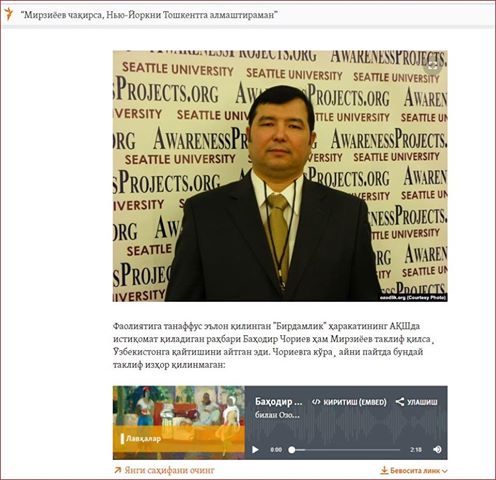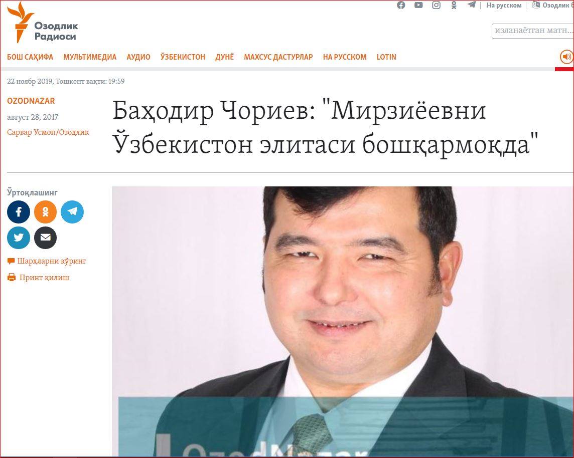 Я считаю, что высказанные Баходыром Чориевым обвинения несправедливы. «Озодлик» - это, наверно, единственная медиа-организация, последовательно освещавшая деятельность движения «Бирдамлик». Баходыр Чориев появлялся у нас в рубрике «Озод назар» («Свободное мнение»), мы постоянно брали у него интервью и короткие комментарии по разным актуальным вопросам.