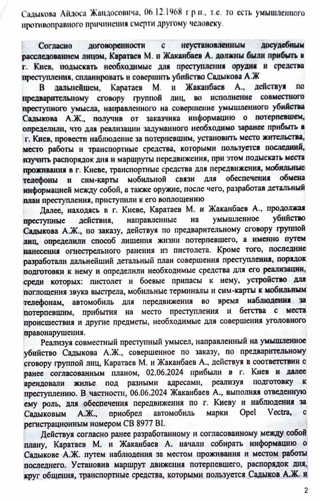 По данным следствия, они получили заказ от неустановленного досудебным расследованием лица на совершение умышленного убийства гражданина той же страны Айдоса Жандосовича Садыкова.