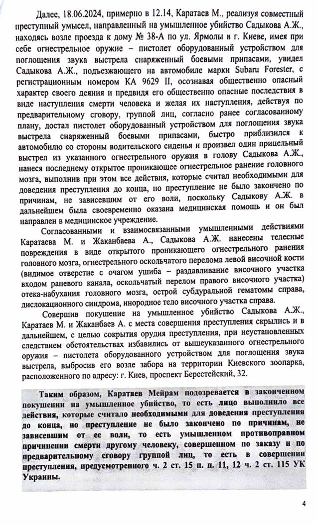 Как считают в генпрокуратуре Украины, Каратаев решил, что выполнил все действия, которые ему были поручены, потому они с Жаканбаевым скрылись. Но жертва оказалась не убита, а тяжело ранена.