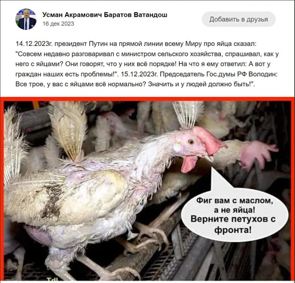 Напомню, в январе прошлого года против Усмана Баратов, возбудили дело по статье о публичном возбуждении ненависти либо вражды к социальной группе. Поводом для уголовного преследования стал пост, связанный с обсуждением резкого роста цен на куриные яйца, опубликованный 17 декабря 2023 года на его странице в «Одноклассниках», с картинкой и текстом «Фиг вам с маслом, а не яйца! Верните петухов с фронта».