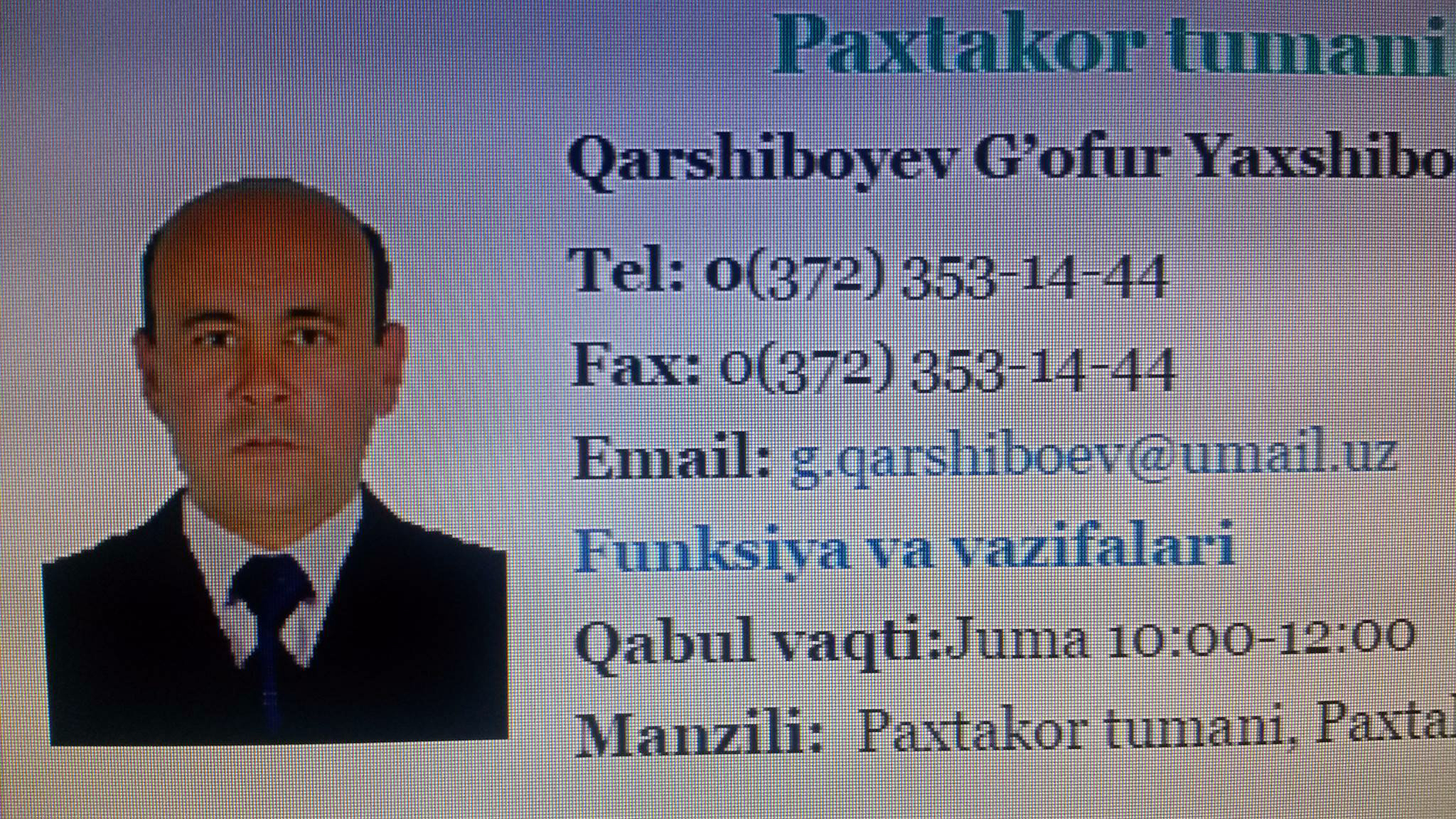 Кроме того, прокурор Пахтакорского района Джизакской области, начальник СНБ по Джизакской области, начальник УВД Джизакской области, начальник РОВД Пахтакорского района Джизакской области. Иначе говоря, всё эсэнбэшно-милицейское и судебное руководство Джизакской области Узбекистана, действующее как единая ОПГ.