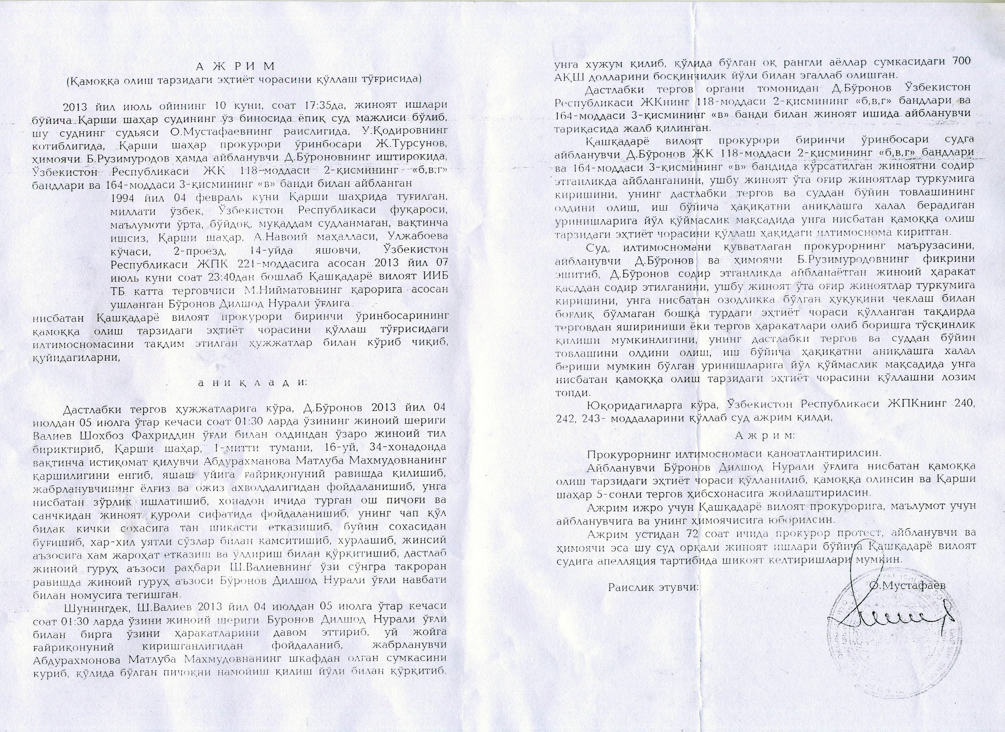 Малохат Эшанкулова изучила переданный адвокатом документ. В нем подробно описывались обстоятельства совершения преступления: ночью 5-го июля 2013 года Дильшод Буронов вместе со своим приятелем Шохбозом Валиевым ворвались в квартиру, которую Абдурахманова снимала в 1-ом микрорайоне города Карши. Девушка была дома одна, не хотела их пускать, но приятели проявили силу. Они нанесли ей множество телесных повреждений, в том числе с помощью кухонного ножа и вилок, отняли 700 долларов, а потом изнасиловали.