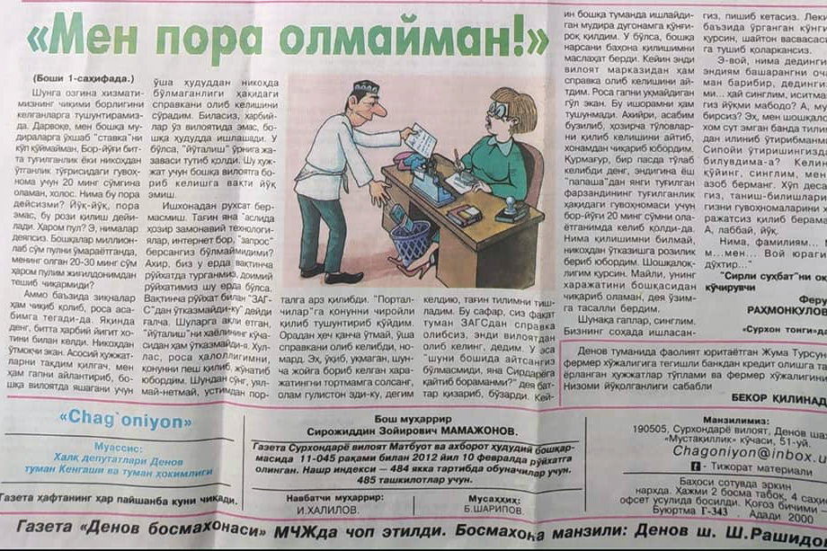Видеозаписи, опубликованные Отабеком Саттори после его участия в качестве слушателя 21 октября 2020 года в суде над Насибой Норбаевой, не нуждаются в комментариях: последняя вымогала у своей клиентки Саодат Вахидовой 1,5 миллиона сумов ($144) и 2 кило фисташек, за что «добровольно» была освобождена от должности (об этом здесь).