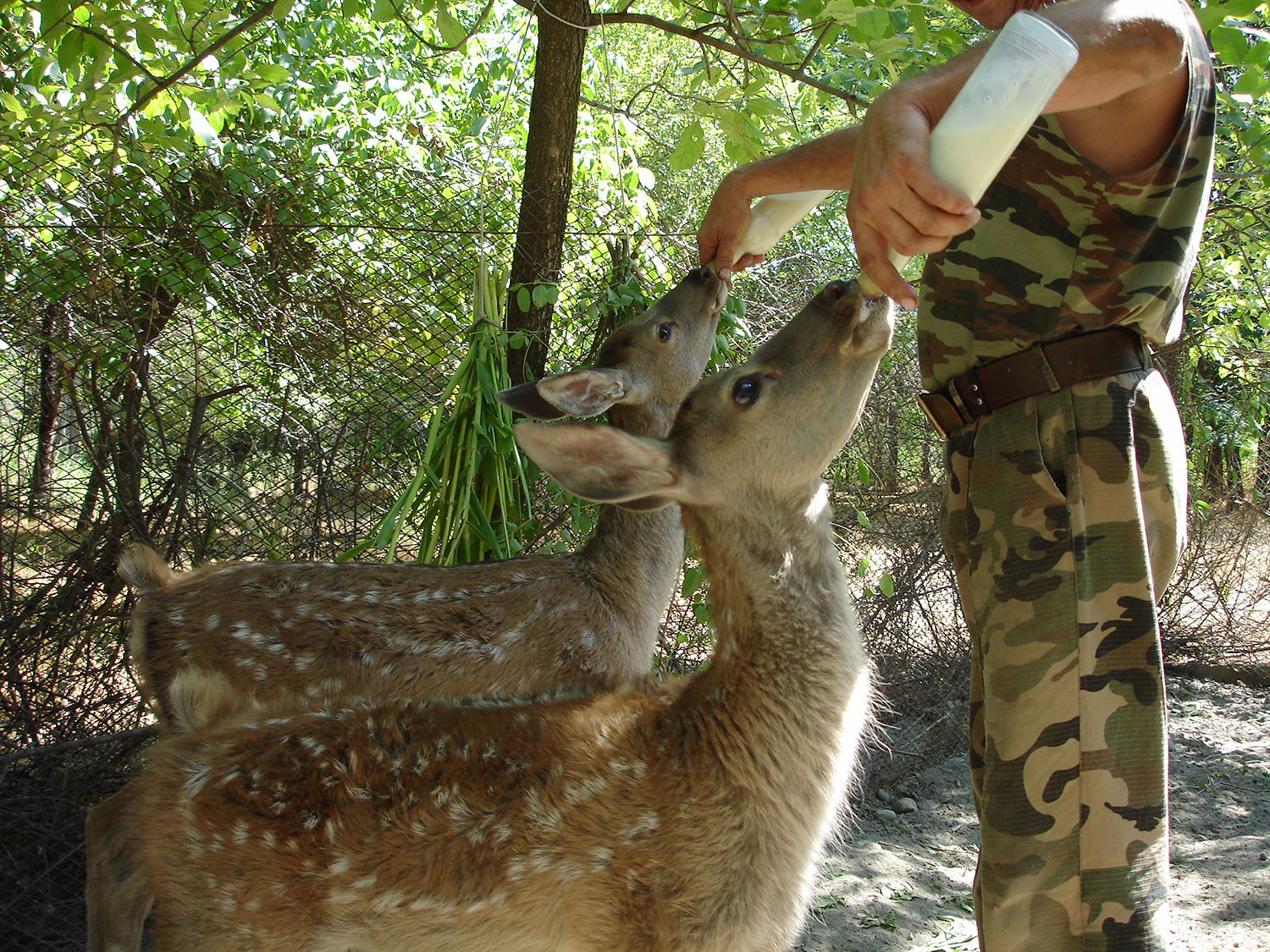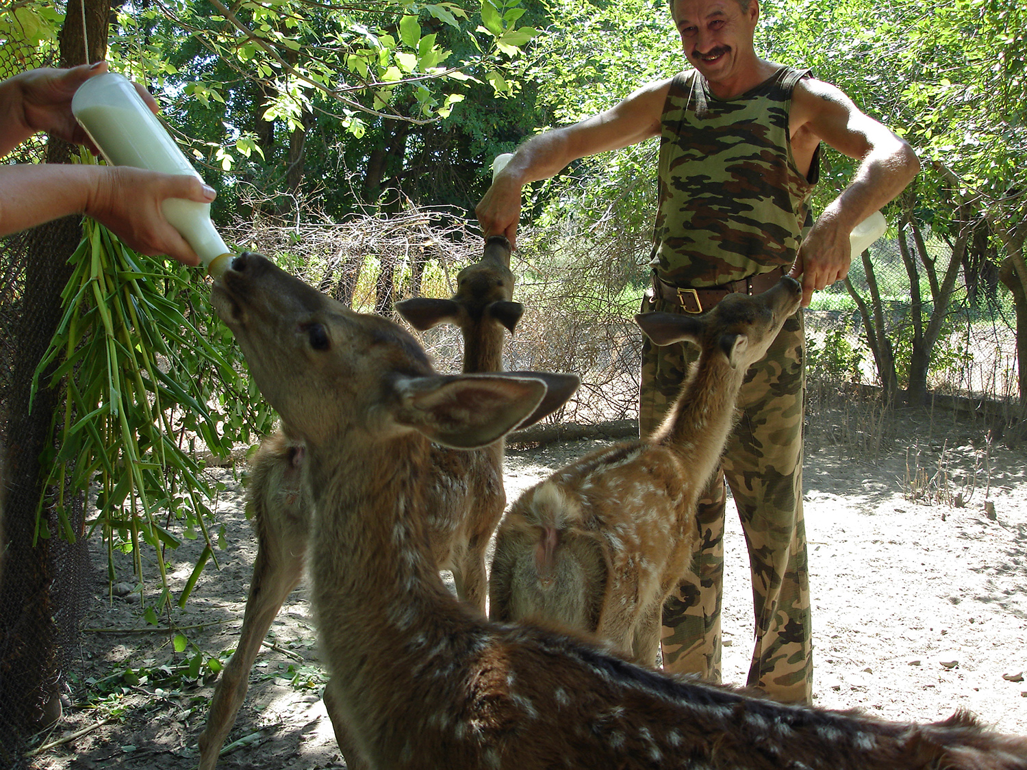 Александр Коршиков, научный сотрудник заповедника, берет в руки бутылки с молоком и входит в вольер. На бутылки надеты соски. Оленята с жадностью набрасываются на них. Кроме этого они жуют связанные в пучки веточки акации, туранги. Едят и кукурузу, и вишню, и черешню - так что в будущем это гроза фермерских огородов, тесно обступающих заповедный лес. А пока Саше приходится даже спать возле вольера, на топчане: как бы с ними чего-нибудь не случилось. По его словам, два дня назад поблизости выли шакалы: учуяли оленят. Шакалы – это серьезная опасность, они ведь стаей нападают…