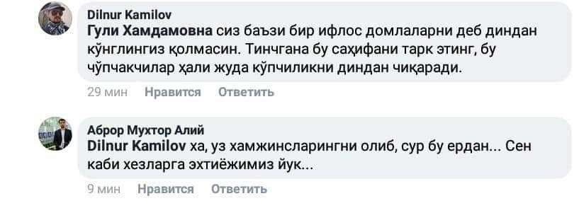 Если почитать личную страницу бывшего заместителя имама в Фейсбуке, можно увидеть, что «под копирку» у него и последователи. Даже сейчас, после случившейся с Дильнуром, вместо сочувствия и поддержки радикально настроенные элементы продолжают писать тому гадости, видимо, не без одобрения самого «предводителя»: «Правильно сделал, надо было [тебя] убить, отрезать язык и руки, чтобы не мог писать против религии!». Хотя пострадавший писал не против религии, а против проповедуемого ими насилия.