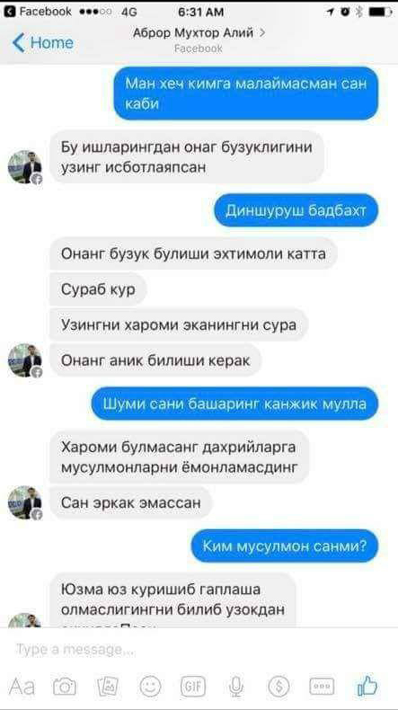 «Конфликт с Абдуллаевым начался с нашей полемики в соцсетях, продолжавшейся более года, - продолжает Камилов. - Я сам певец и музыкант, но в последние год-два у меня проснулся интерес к религиозным учениям (познанию их сути, хотя я сам в мечеть не хожу), благодаря чему в Ютубе и Фейсбуке я познакомился с интернет-пользователем по имени Аброр Мухтор Алий, выступающему как знаток тонкостей религии. Он вел онлайн-уроки, давал консультации на религиозные темы, отвечал на вопросы, что-то советовал.