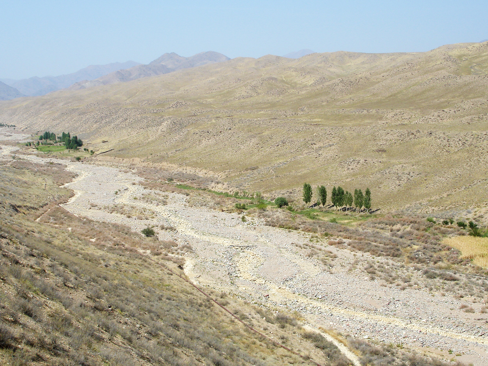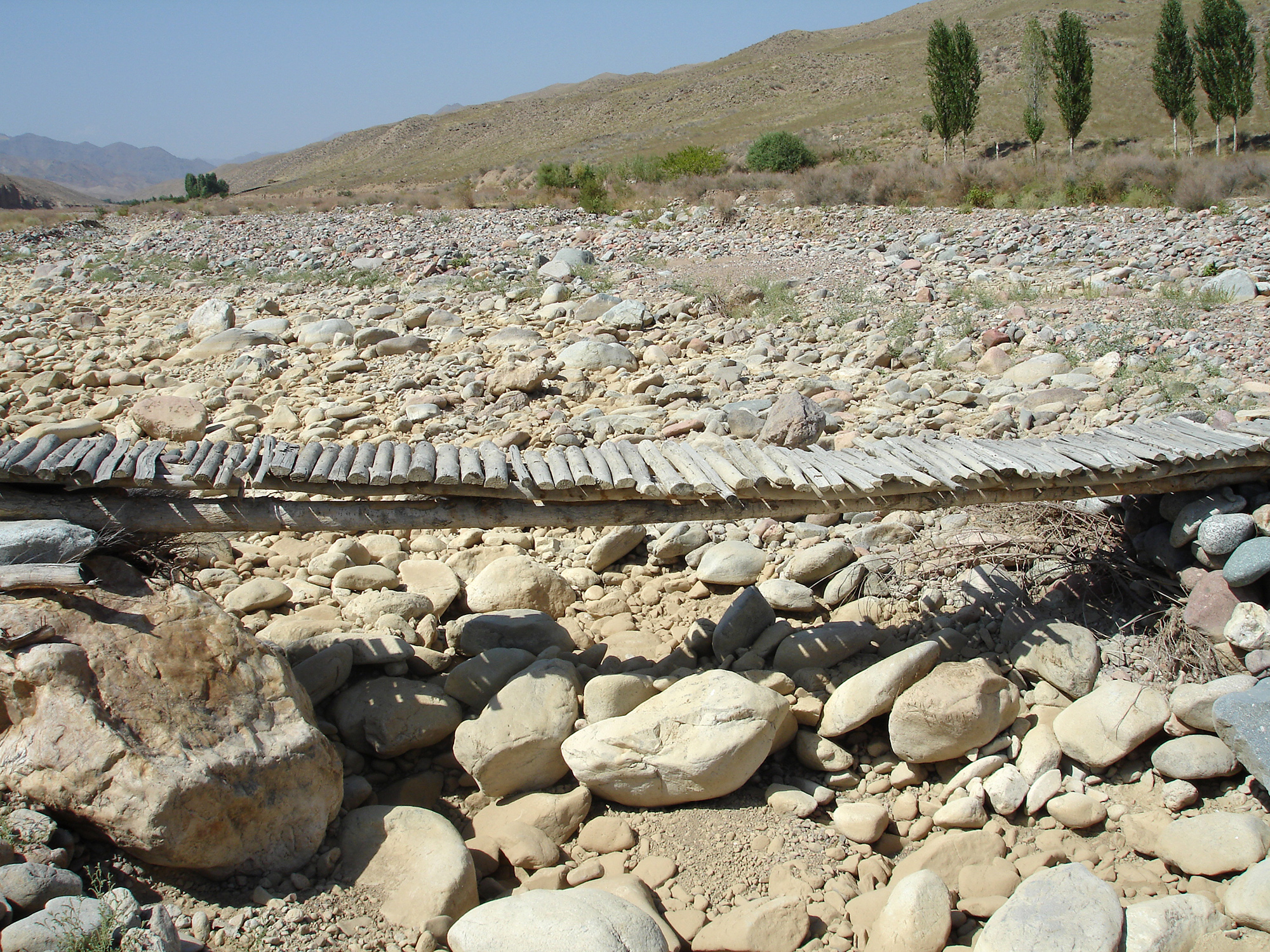 Проехав по дороге еще пару километров, въезжаем в горы, такие же безжизненные как предшествующая им степь. Ни деревца, ни кустика, ни былинки – за долгое лето горные склоны начисто выгорели. Даже от бурлящей в глубине ущелья речки остались одни только камни – вода высохла. О том, что она здесь когда-то была, напоминает лишь узкий деревянный мостик.