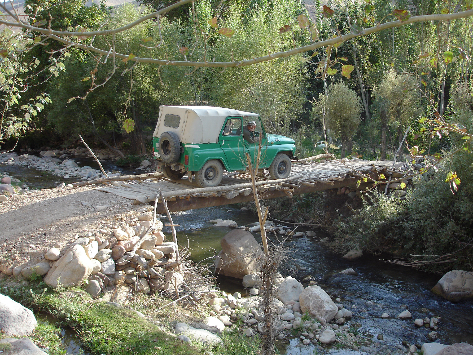 Вскоре дорога исчезает. Дальнейший путь пролегает по камням вдоль русла пересохшей реки. Каменистая поверхность слегка придавлена, и это позволяет различать еле заметную колею. Думаю, что ни одна машина концерна «УзДЭУавто» не смогла бы здесь проехать. Ну, может, и смогла бы, но только в одну сторону – потом бы она сразу развалилась. А старый советский «газик» лихо прыгает по торчащим из земли глыбам и булыжникам. Иному транспорту здесь пробиться не под силу. В общем, эта дорога и есть кратчайший путь, связывающий Сарвак с миром современной цивилизации.