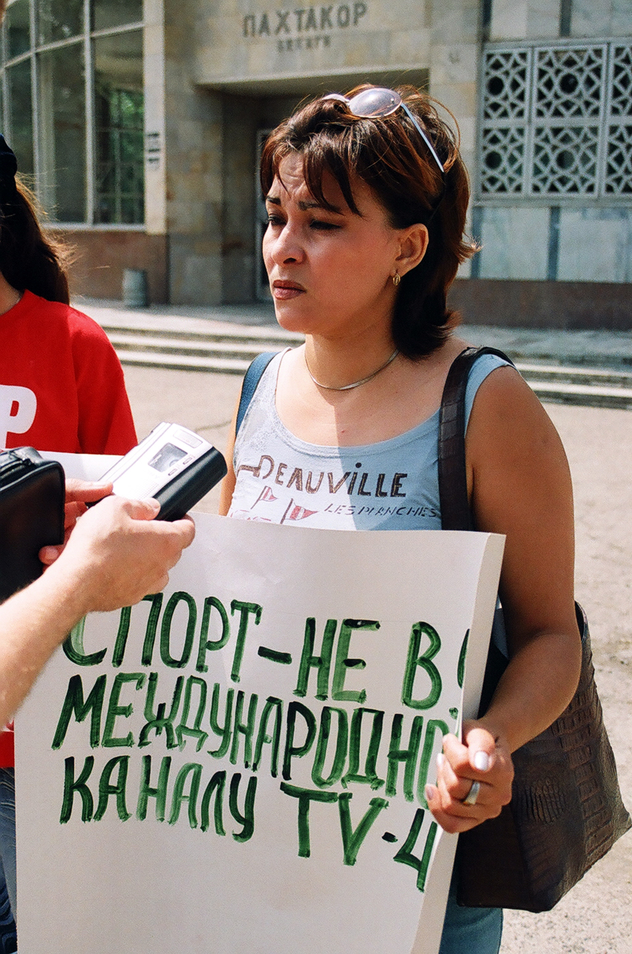 А днем раньше подобная акция прошла возле телевидения. Масштабы ее, правда, были значительней. Она была организована представителями правозащитных организаций, которые выступили за отмену цензуры, свободу СМИ и против решения о перепрофилирования международного телеканала ТВ-4 в спортивный. В числе протестующих была и редактор четвертого канала Эльмира Хасанова. Вот что она нам сказала: