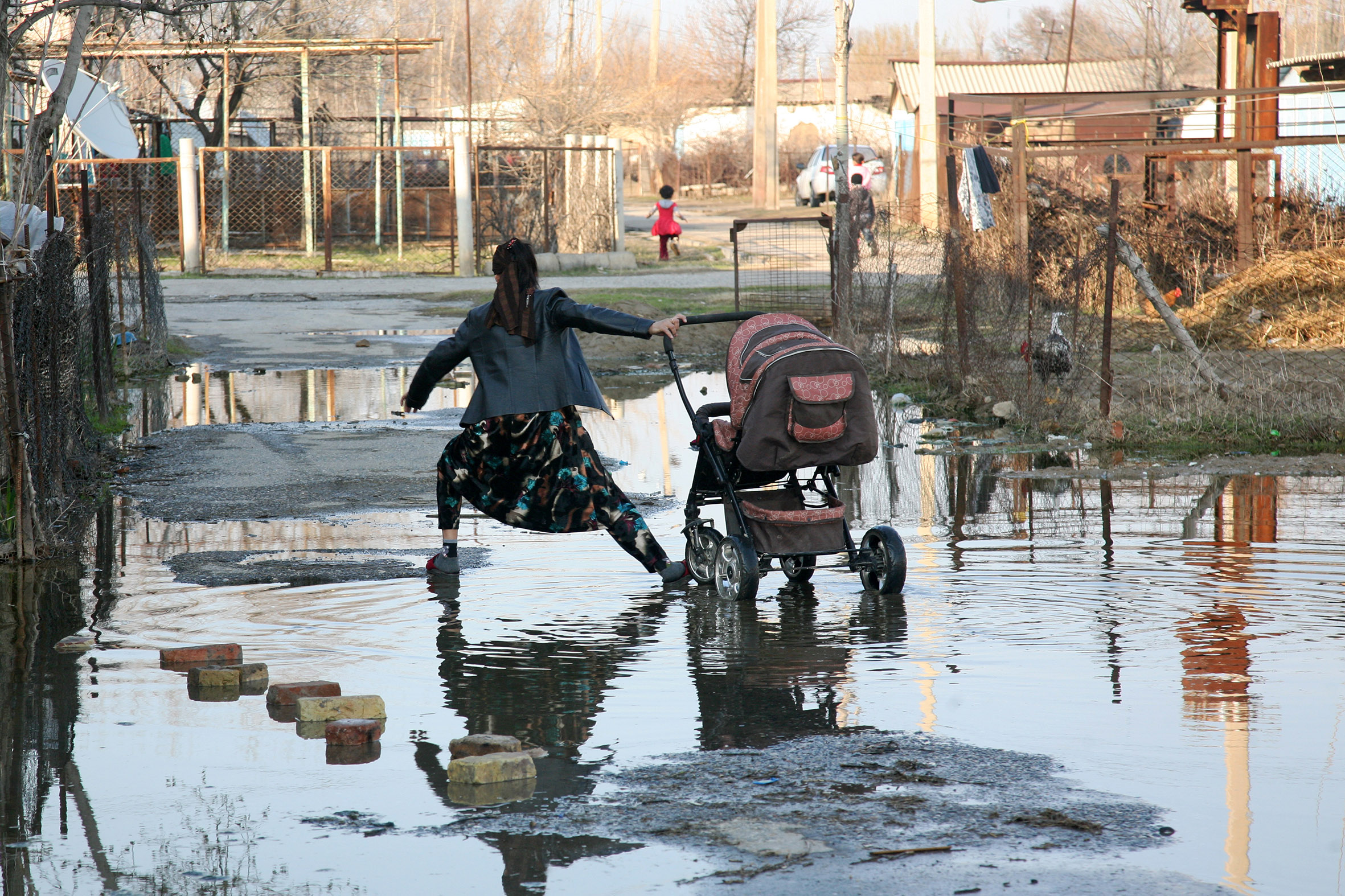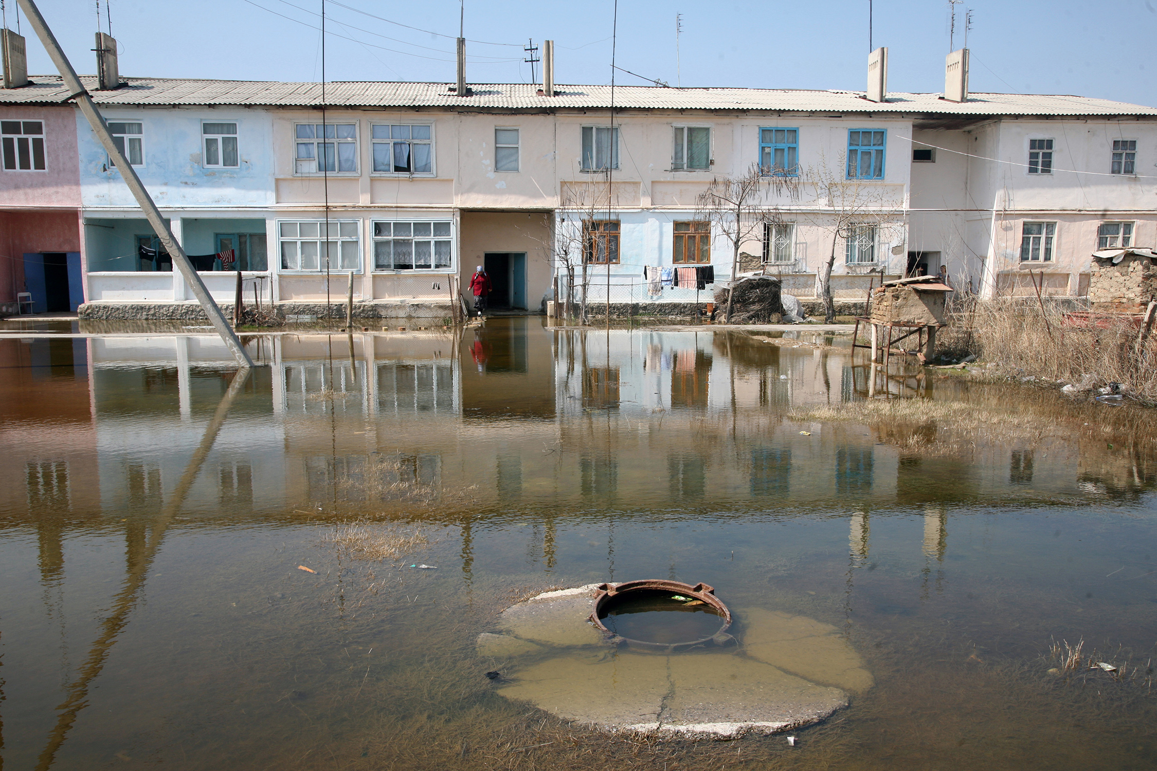 Во время весеннего разлива тут заливает большие участки земли – воде некуда деваться. Жители прыгают по островкам к дороге и общим туалетам.