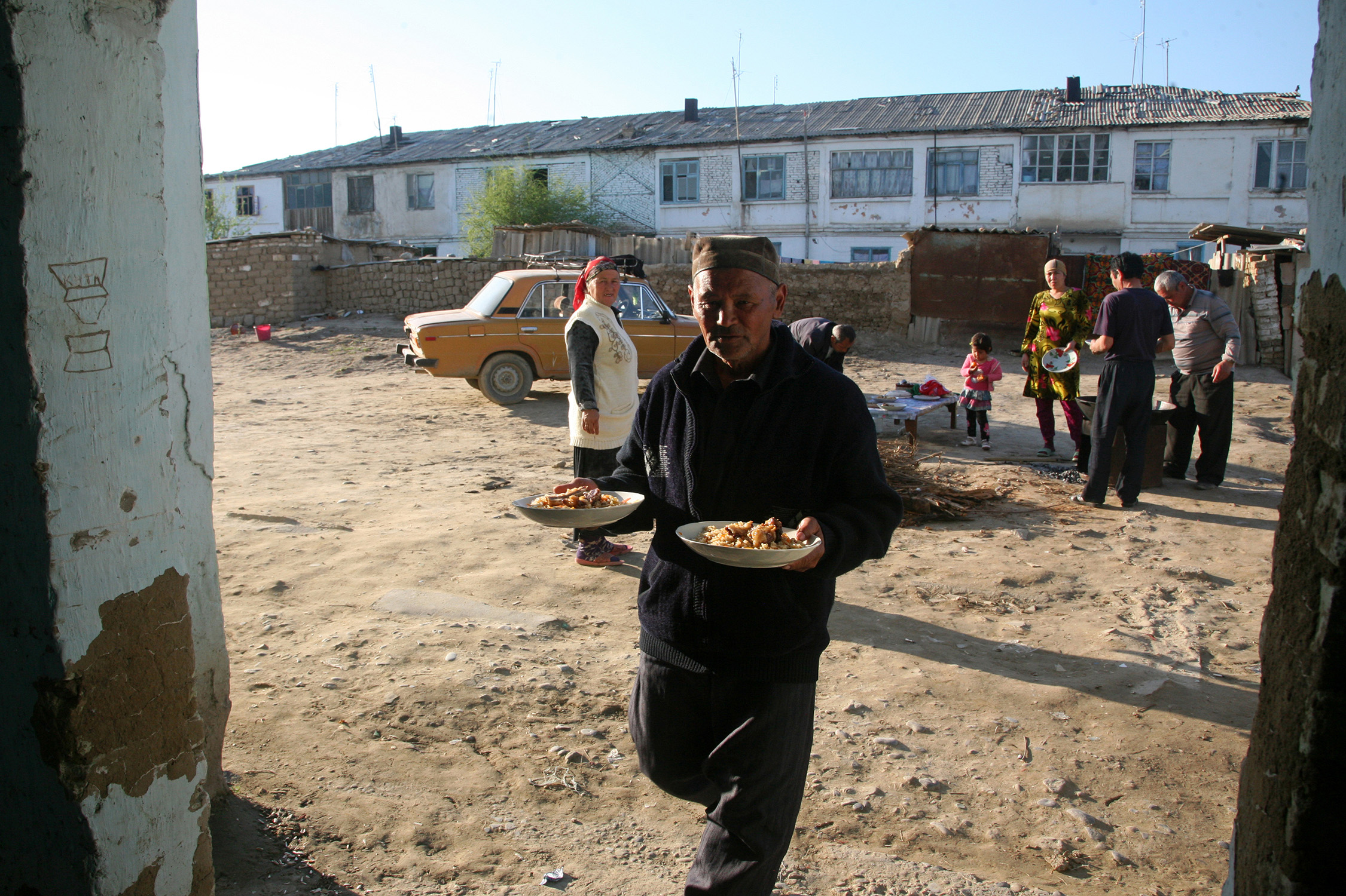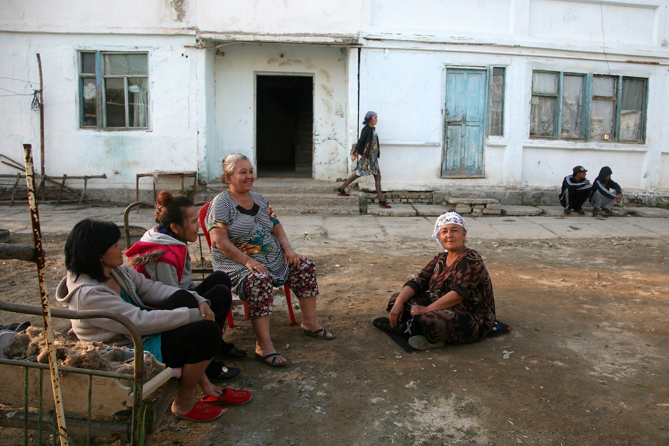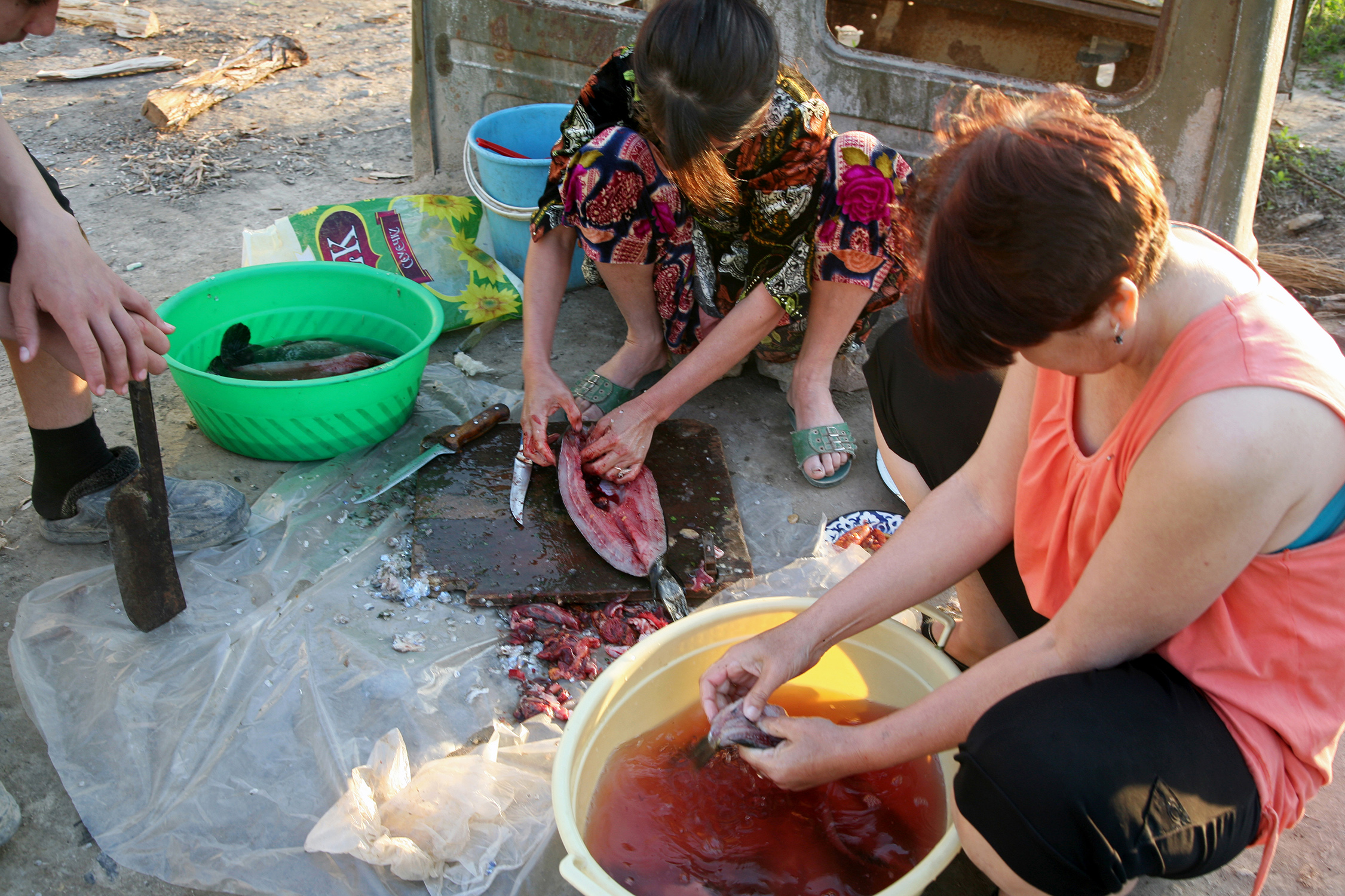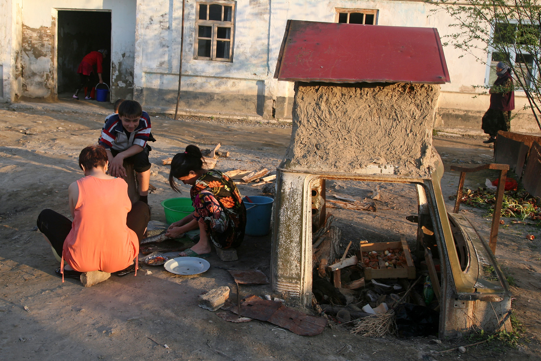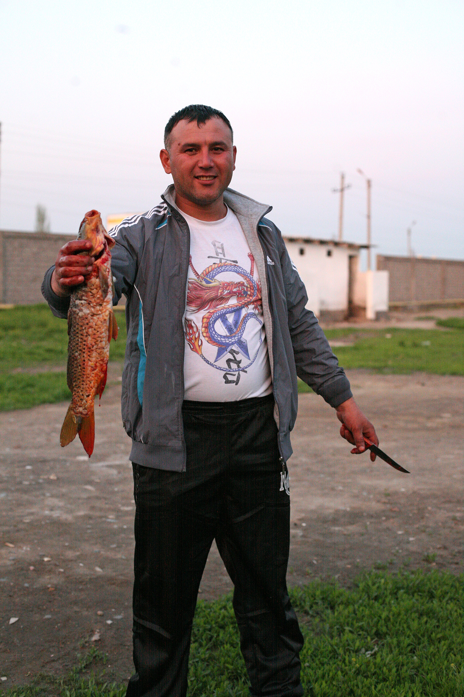 Рита, казашка, и её муж Гани (Гена). В детстве Рита играла на фортепиано, выигрывала конкурсы. Судьба занесла сюда. Готовит, печет пирожки для продажи на хлопкоперерабатывающем заводе, на скотном рынке. «Вот сегодня 200 штук продала». Русская община – Гани, Рита, Ибрагим (полуузбек-полутатарин), таджик Шароф и еще несколько человек. Угощают нас. Гани – заядлый рыбак. У него дома, как ни странно, есть интернет.