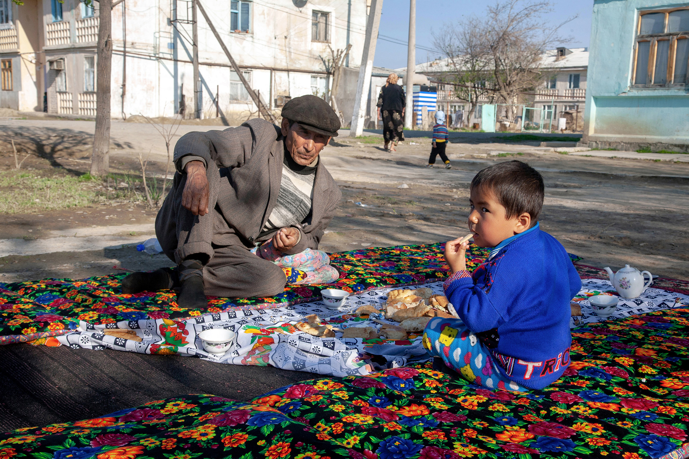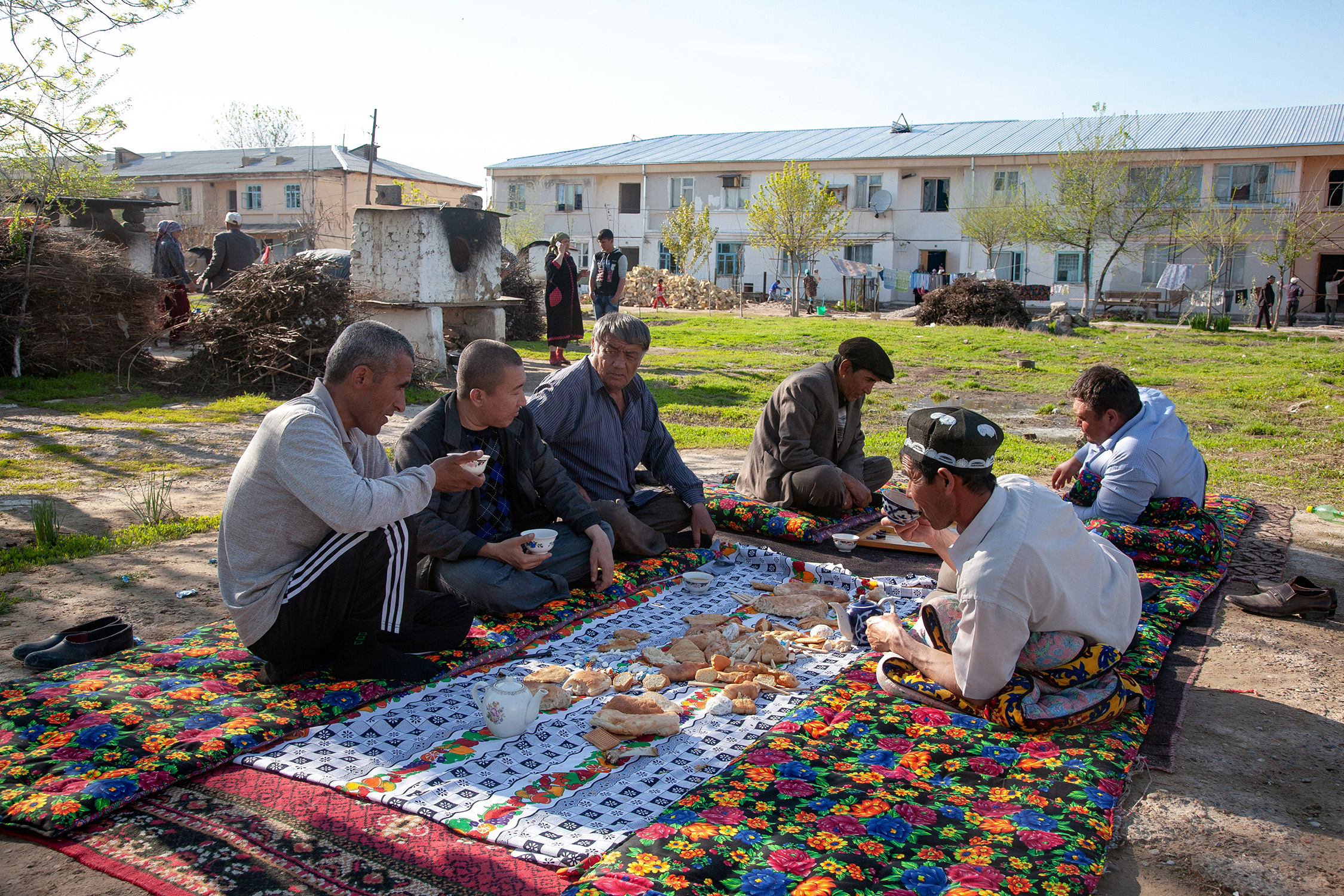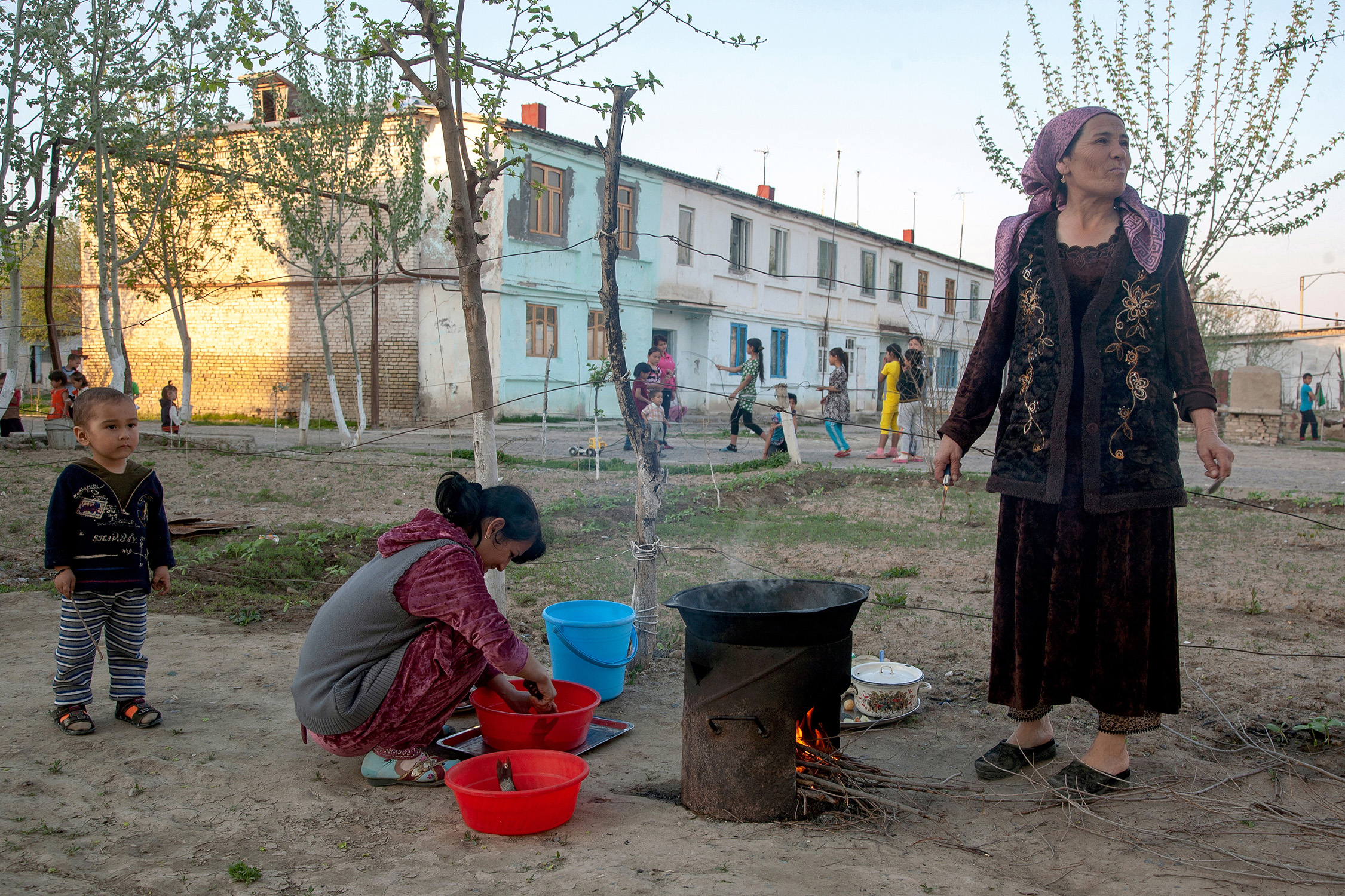 «Новый Узбекистан» оказался состоящим из полутора десятков аккуратных многоэтажек, едва ли не всю дворовую территорию которых занимали игровые площадки с тренажерами, прочными – чтобы их сразу не разломали. Там было полно детворы. Возле дома в большом казане делали плов. В соседнем дворе на цветастом одеяле сидела компания мужчин, играли в карты, пили кока-колу. По их словам, всё было нормально. Проехали дальше, таксист высунулся и спросил группу женщин, как они живут – есть ли газ, поднимается ли вода на последние этажи. Они сказали, что да. Шофёр кивнул на меня – «Это журналист», и одна тут же картинно добавила «Рахмат Мирзиёевга». («Спасибо Мирзиёеву»).